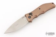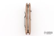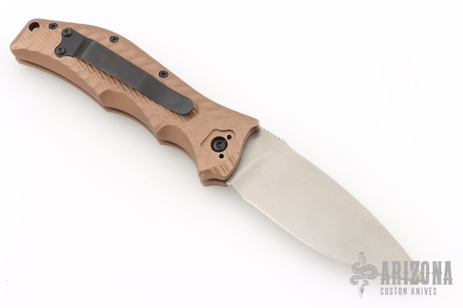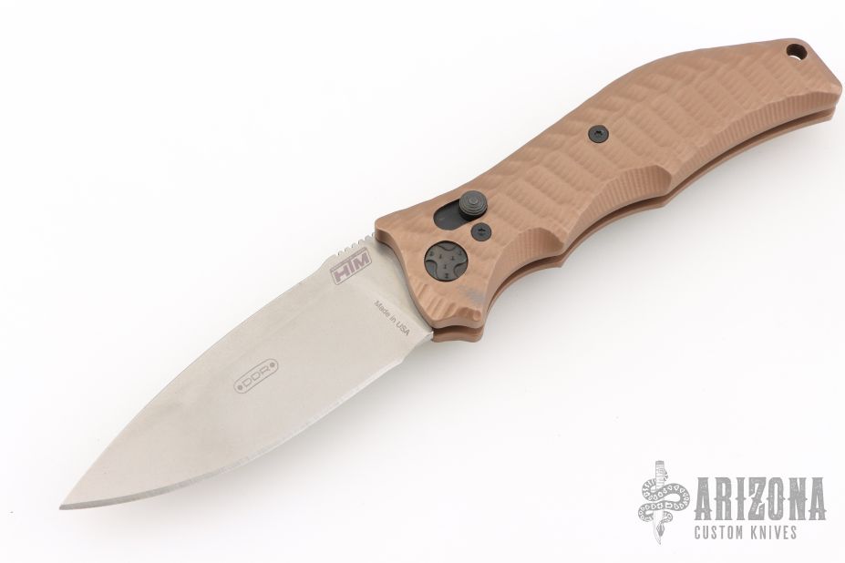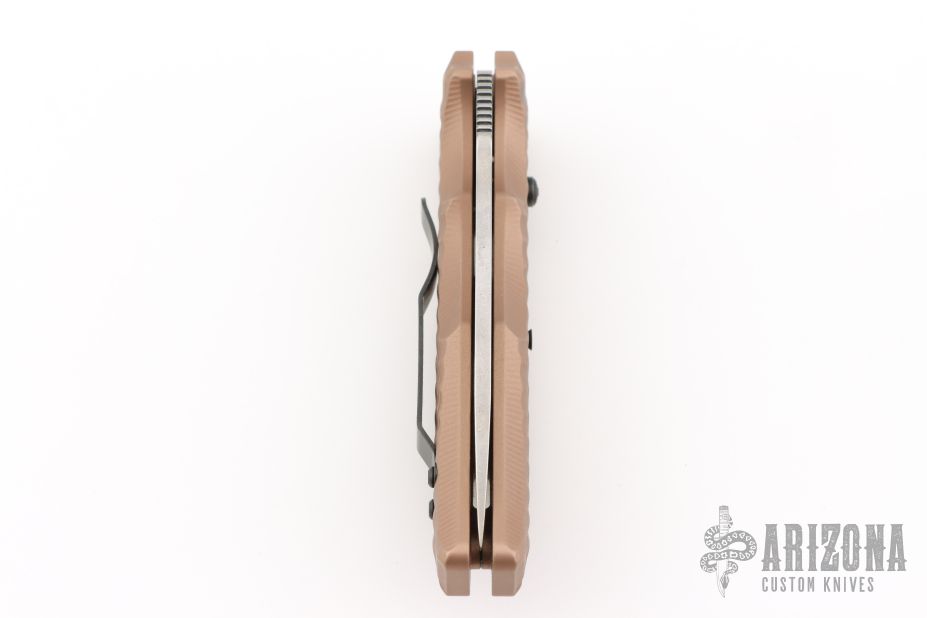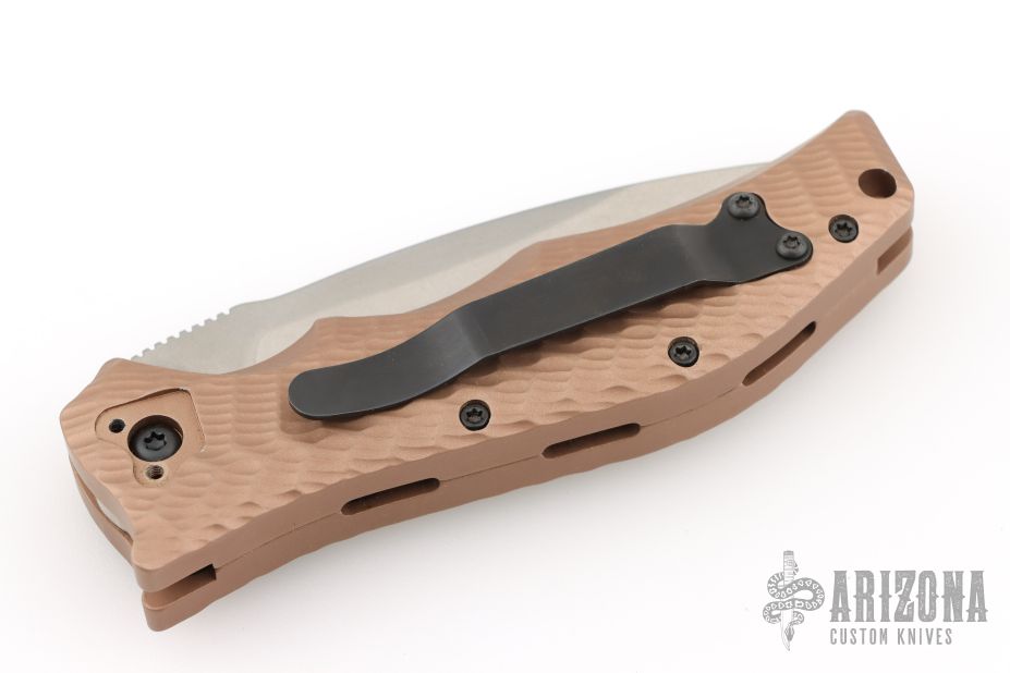 This Gun Hammer Torpedo Automatic is a Darrel Ralph Design executed by HTM Knives. It features a lightly tumbled drop point blade with notched thumb rest. The handle is comprised of  sculpted dark earth anodized aluminum with a black-coated stainless steel pocket clip that can be positioned for tip up or tip down carry. Has some light scuffs and scratches, great overall condition.