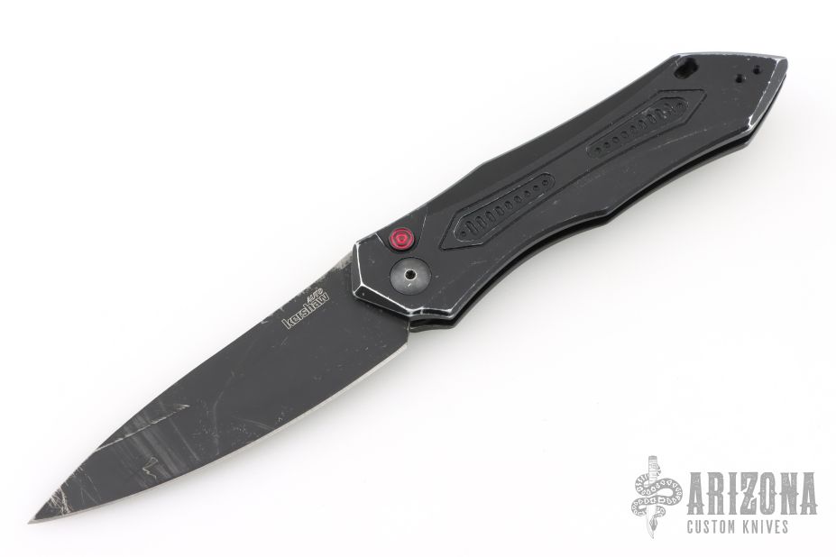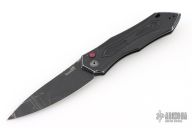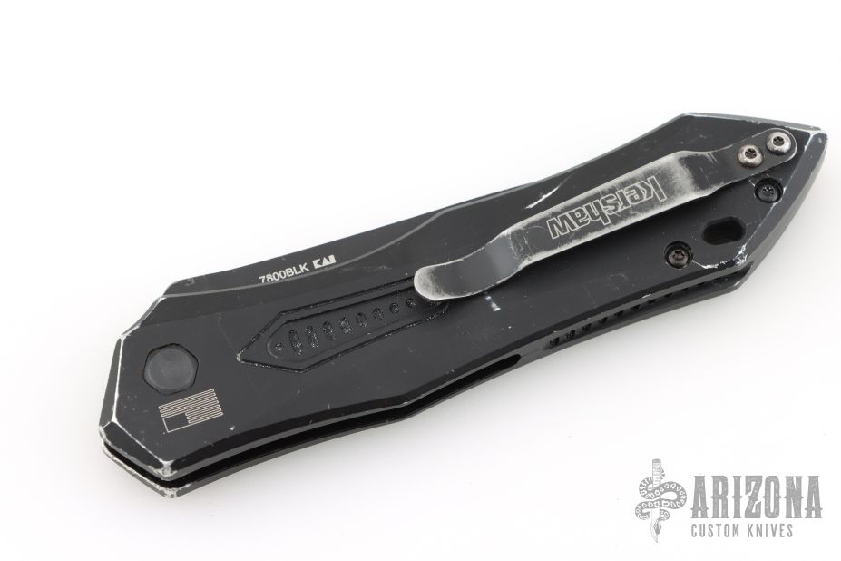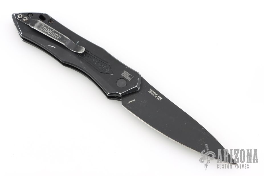 This Launch 6 7800BLK from Kershaw features a black coated drop point blade. The handle is comprised of black coated machined aluminum with a stainless steel tip up pocket clip. Lanyard hole in pommel. Has scuffs and scratches throughout, fair condition.