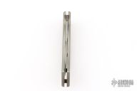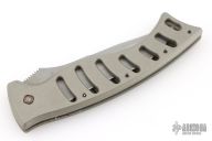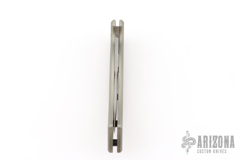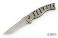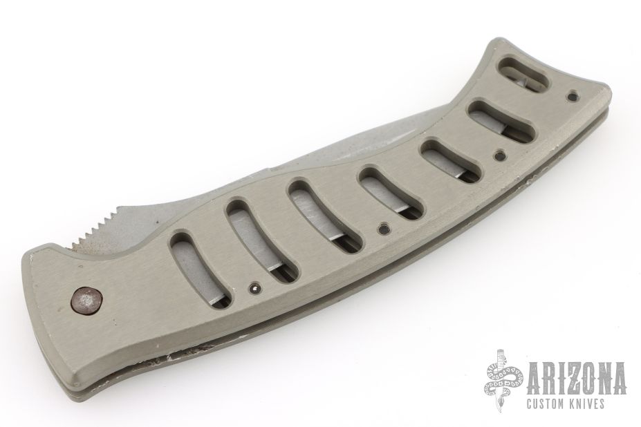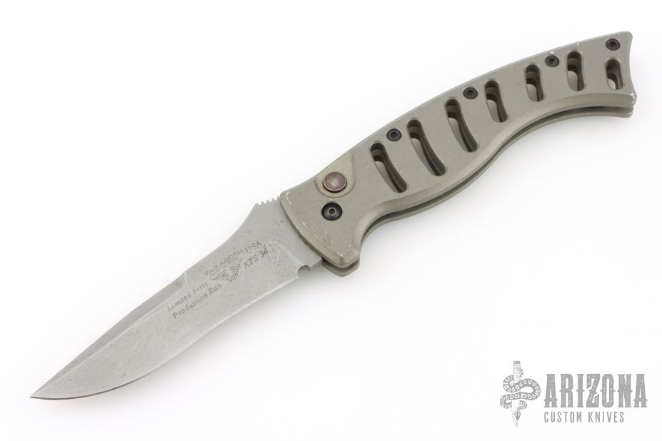 This Paragon X-O Lite auto has a bead blasted recurve blade with notched thumbrest and false top edge. Handle is anodized aluminum with a push button. Has scuffs and scratches throughout, fair condition.