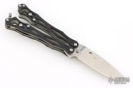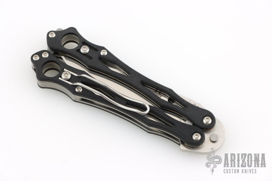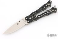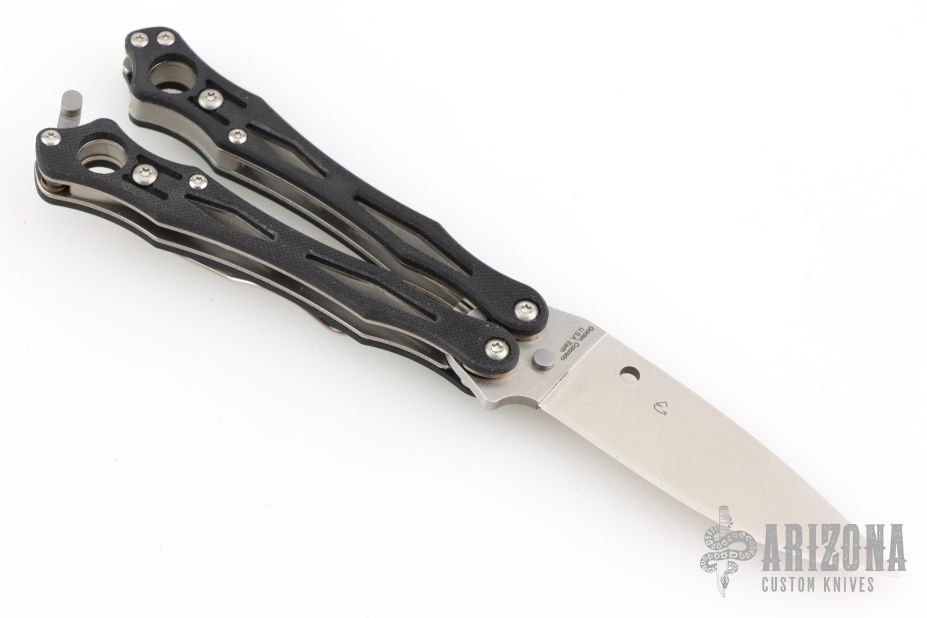 This Spyderfly 2 Balisong by Spyderco has a satin finished blade. Handle is black G10 over stainless steel liners and stainless steel paper-clip style pocket clip. Comes with original box. Excellent condition.