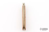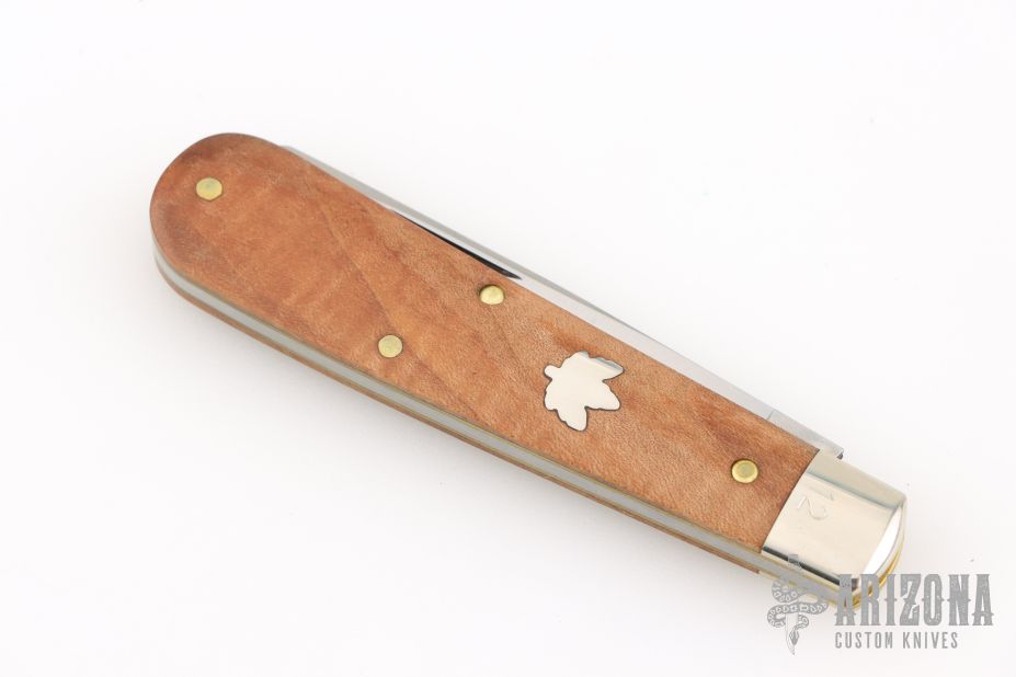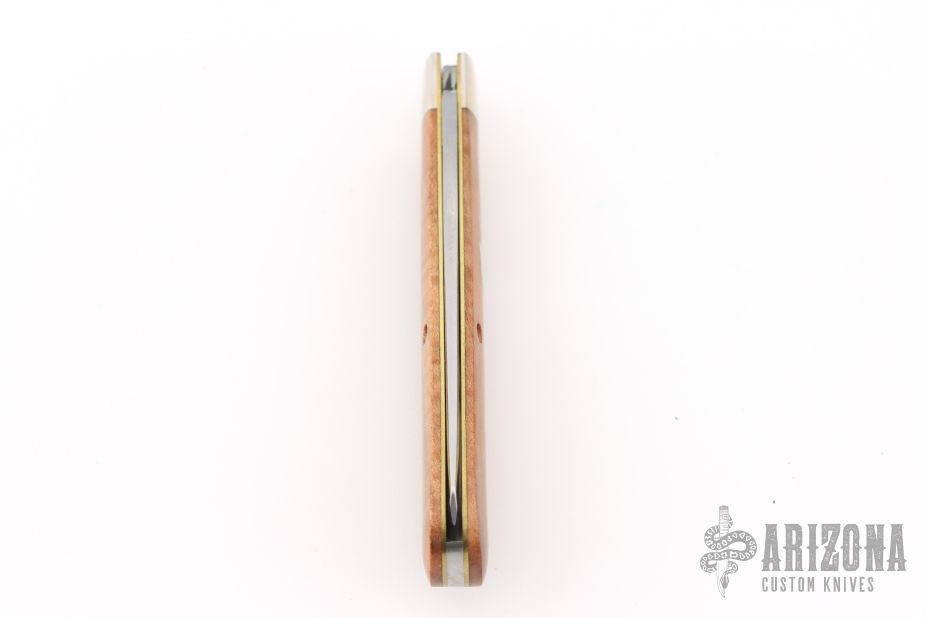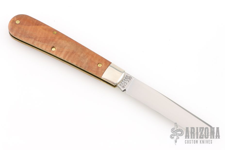 This knife by Great Eastern Cutlery features a satin finished blade with nail nick. The handle has nickel silver bolsters that are pinched, brass liners, and wood covers. Has half-stop. Comes with original tube, button, and wax paper. Excellent condition.