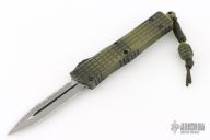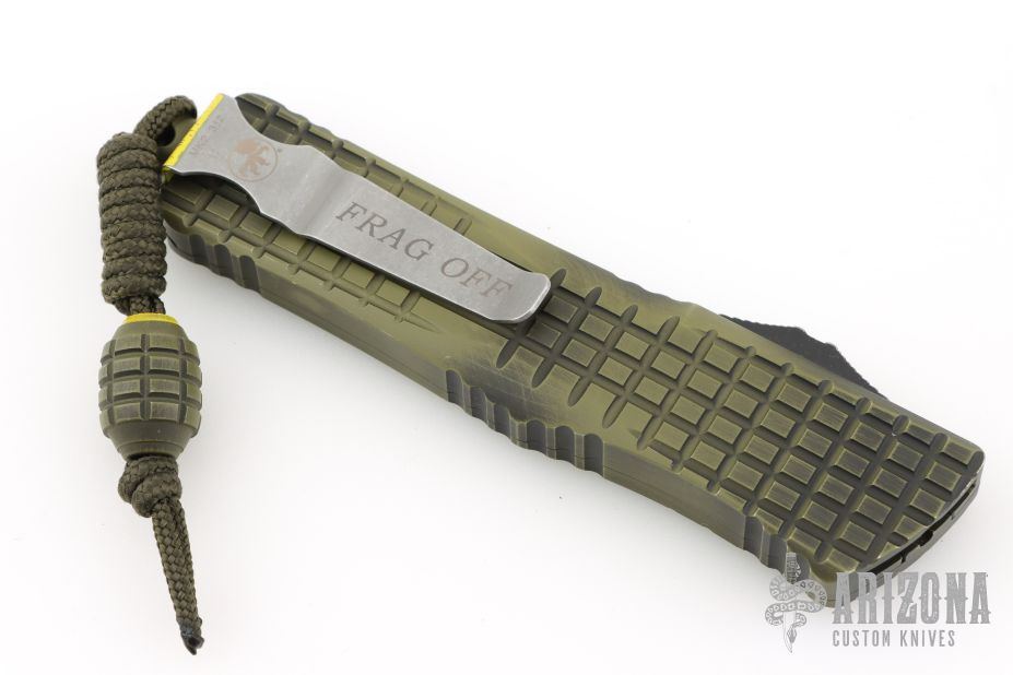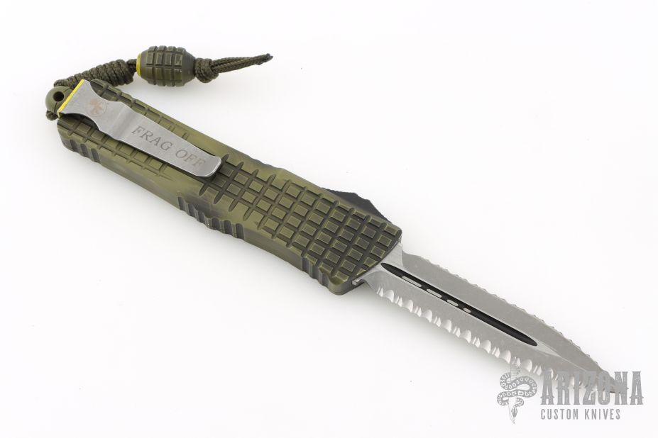 This Combat Troodon OTF automatic by Microtech knives features a double edged, Apocalyptic finished reverse full serrated blade. The handle has a grenade green frag pattern aluminum handle with black hardware, tip down carry. Glass breaker. S/N 312. Comes with original box, papers, and attached lanyard bead. Excellent condition.