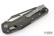 - Handle: Rugged green polymer scales with textured grip and ergonomic shaping