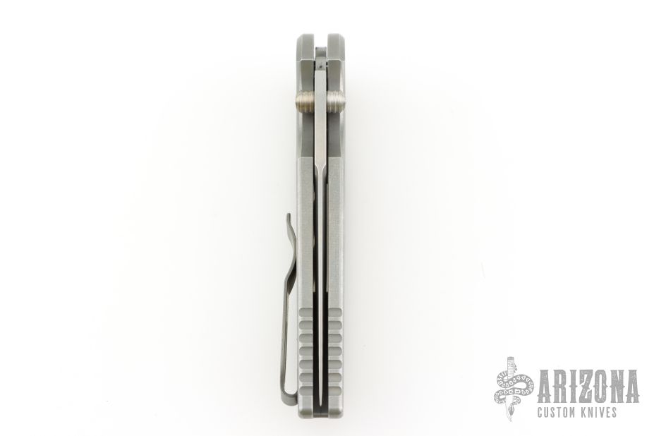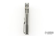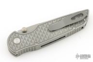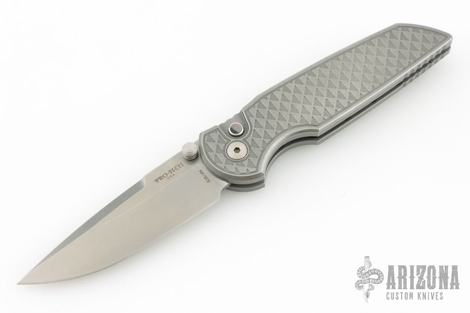 This Integrity by Pro-Tech Knives features a stonewashed drop point blade with a dual thumbstud. The handle has a milled and stonewashed steel frame with a blasted tip up clip, lanyard hole.  Black lip pearl inlaid push button. Nice detent, lockup and blade seating. Excellent condition.  Comes with original box and papers. Excellent condition.