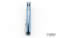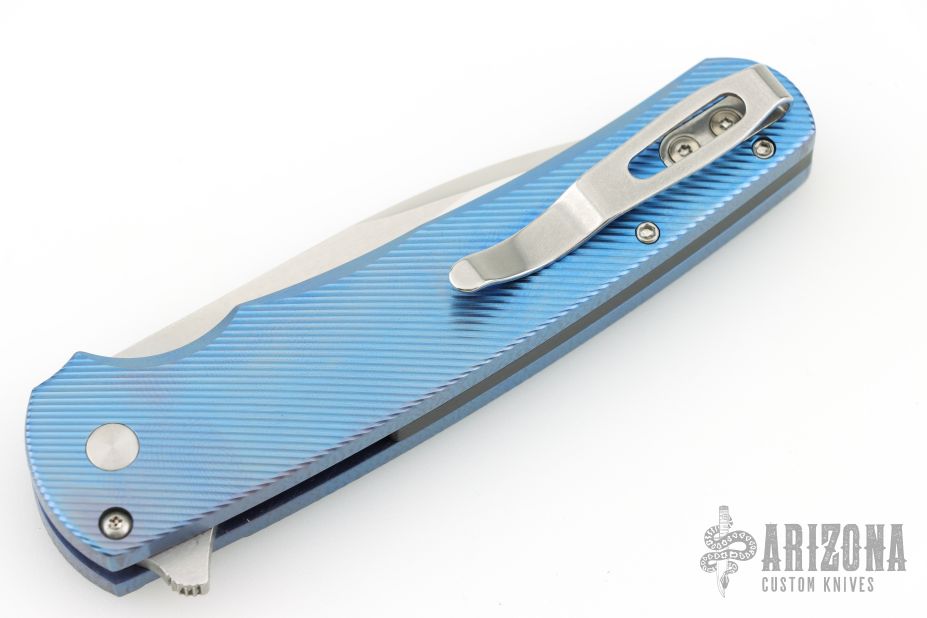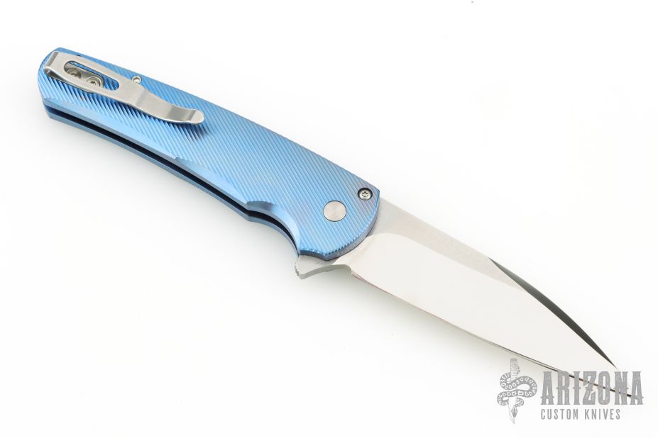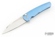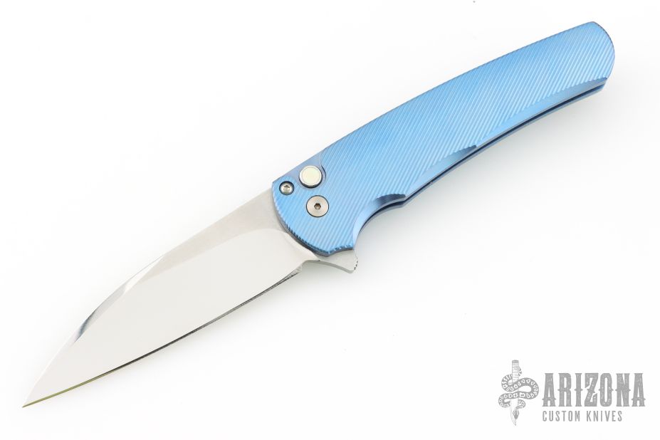 This Malibu by Pro-Tech features a Mike Irie hand ground mirror polished blade with flipper. The handle has a milled and anodized titanium frame with gold lip pearl inlaid push button, black G-10 backspacer and a stainless steel tip up clip. Comes with original box and papers. Excellent condition.