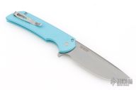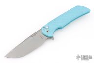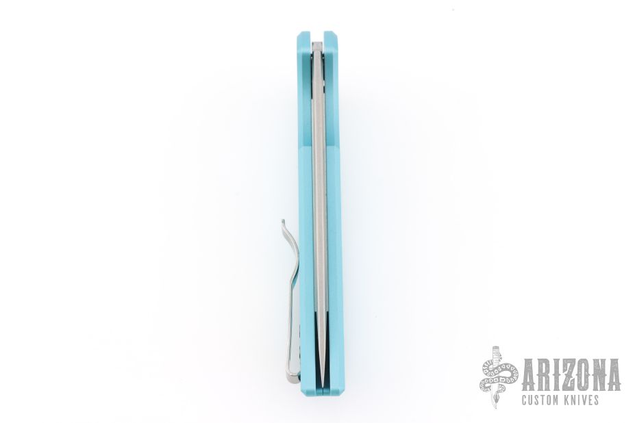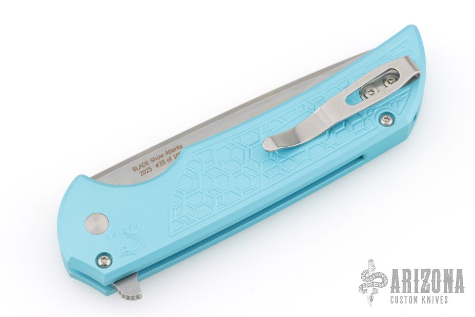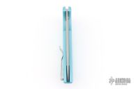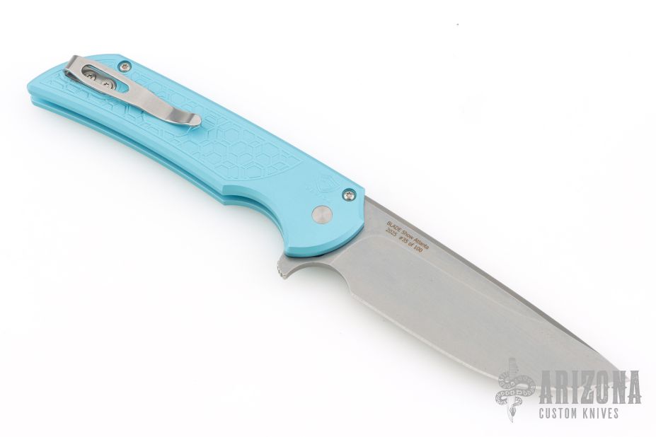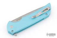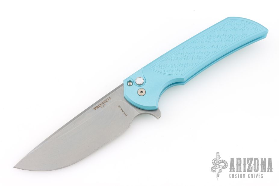 This Mordax by Pro-Tech is a Ferrum Forge design and features a stonewashed drop point blade. The handle has milled Tiffany blue aluminum frame with tip up stainless steel clip. Mother of pearl inlaid push button. Comes with original box and papers. #35 of 100. Excellent condition.