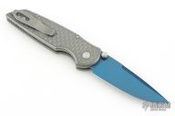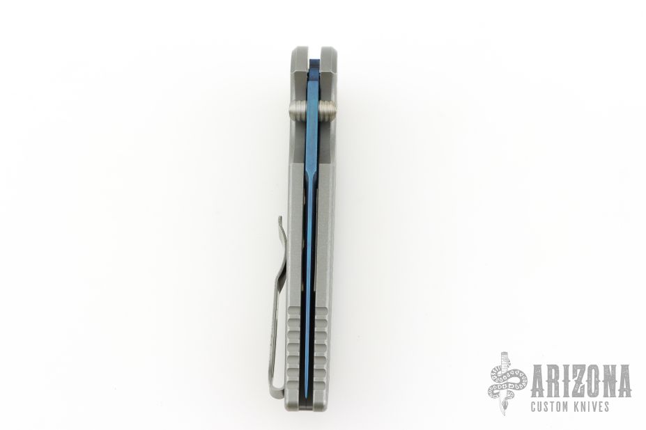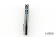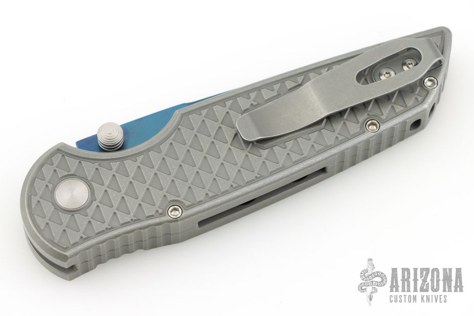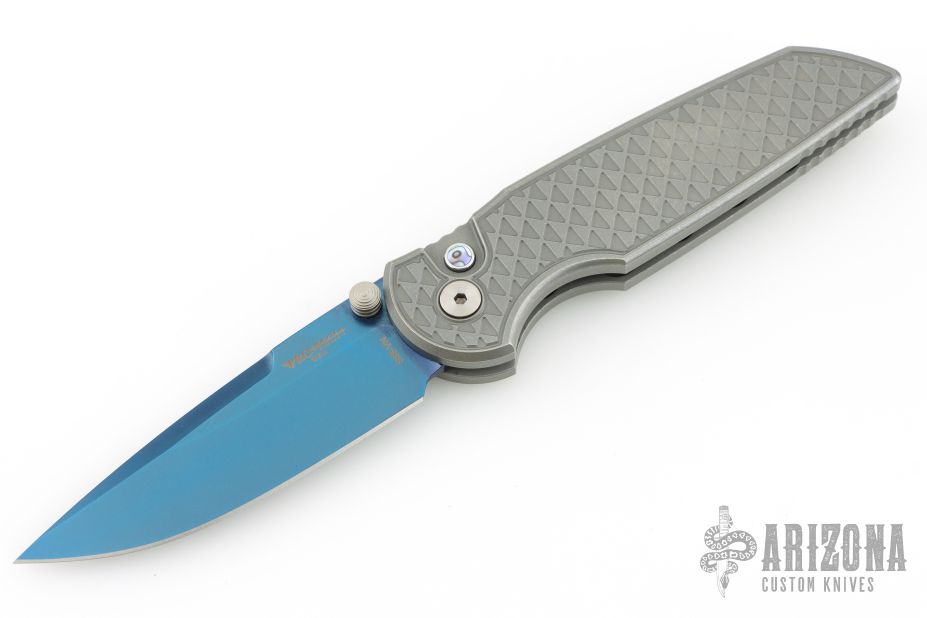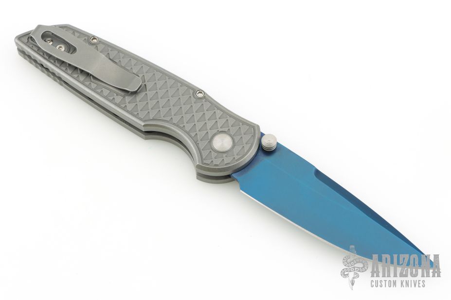 This Integrity by Pro-Tech Knives features a sapphire blue drop point blade with a dual thumbstud. The handle has a Relic milled steel frame with a matching tip up clip, lanyard hole.  Abalone inlaid push button. Nice detent, lockup and blade seating. Excellent condition.  Comes with original box and sheath. Excellent condition.