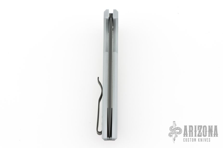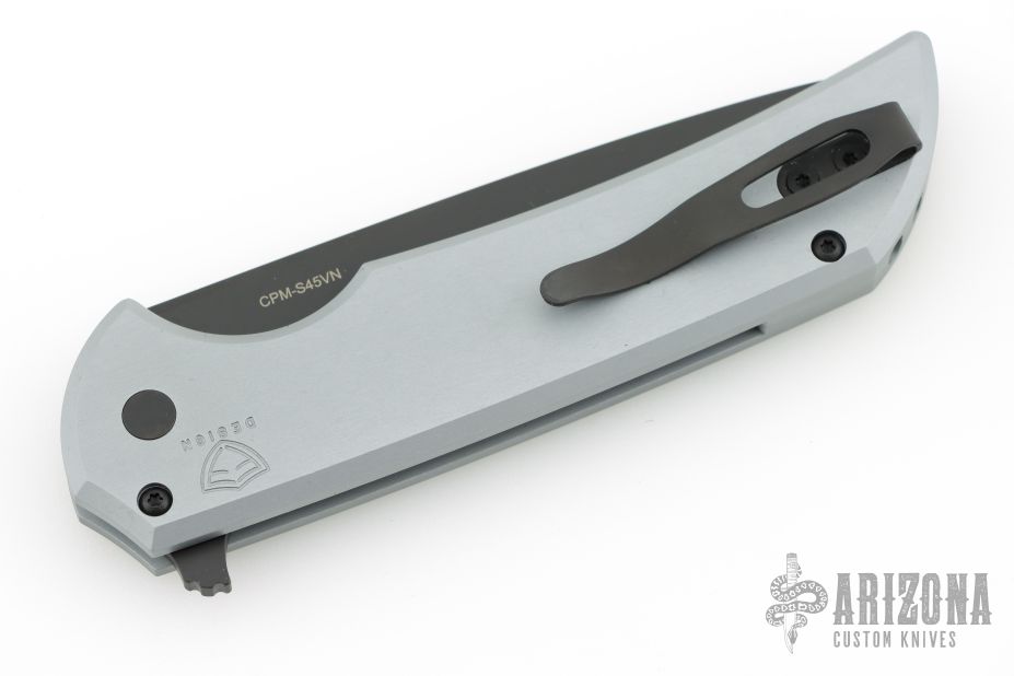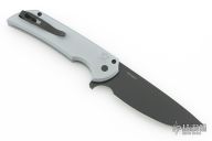 This Mordax by Pro-Tech is a Ferrum Forge design and features a black drop point blade with flipper. The handle has grey aluminum frame with black tip up stainless steel clip. Pearl inlaid push button. Comes with original box pouch, and papers. Has a couple light scuffs, excellent condition.