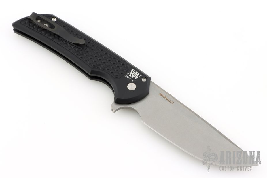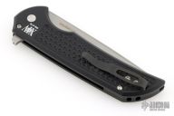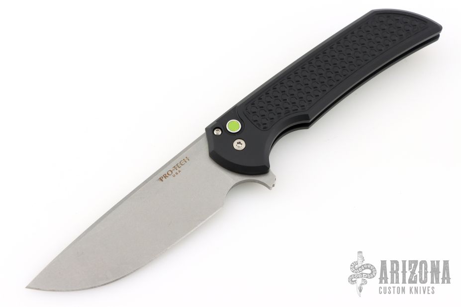 This Mordax by Pro-Tech is a Ferrum Forge design and features a stonewash finish drop point blade. The handle has milled a black aluminum frame with black tip up stainless steel clip. Toxic green g10 inlaid push button. Comes with original box, pouch, and papers. Has a couple light scuffs, excellent condition.