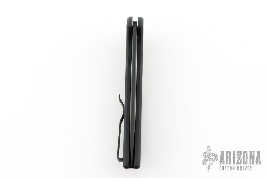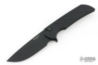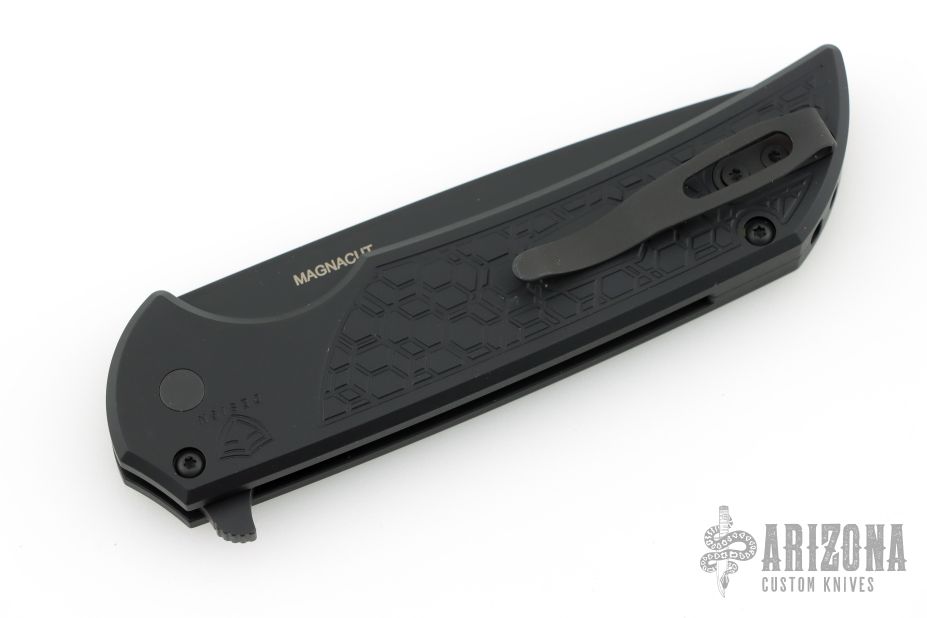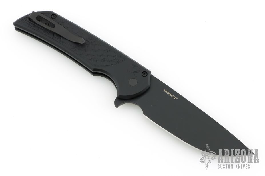This Mordax by Pro-Tech is a Ferrum Forge design and features a black drop point blade with flipper. The handle has milled black aluminum frame with black tip up stainless steel clip. Black push button. Comes with original box, pouch, and papers. Excellent condition.