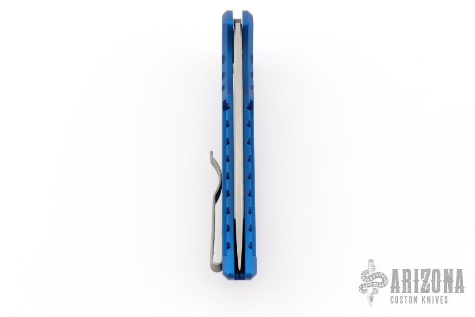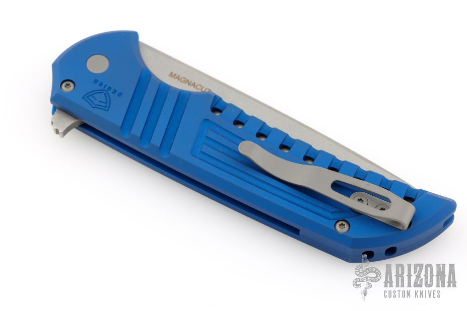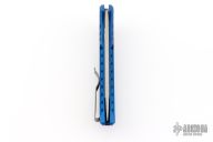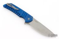 This Mordax by Pro-Tech is a Ferrum Forge design that features a stonewashed blade with flipper. The handle has a blue milled aluminum frame with bead blasted hardware and tip up stainless steel clip. Comes with original box, pouch, and papers. Excellent condition.