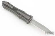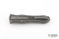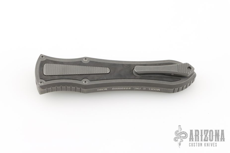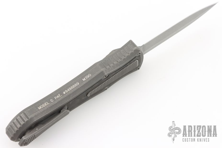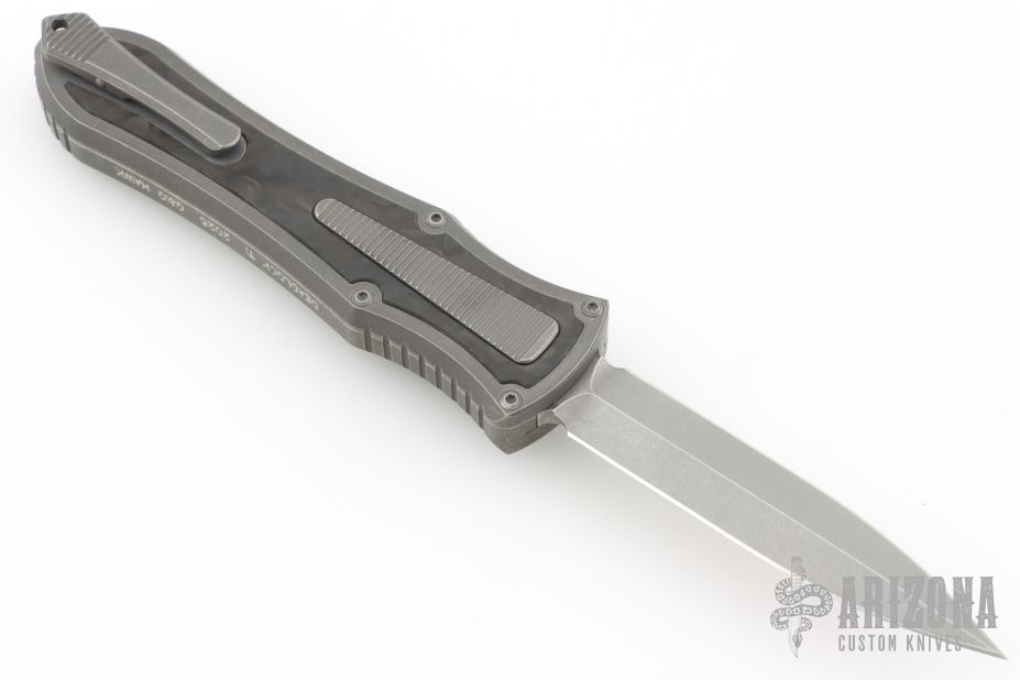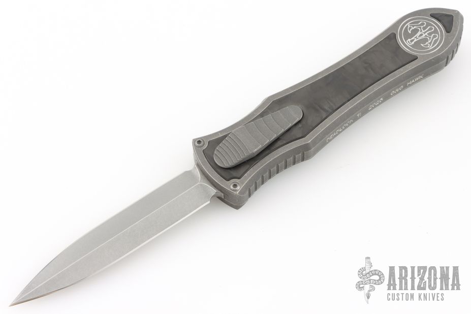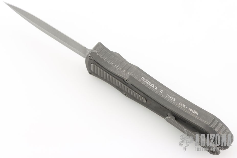 This knife is a Deadlock Model C by Grant and Gavin Hawk. It has a double-edged blade. The handle has a Fat Carbon inlays in the stonewashed titanium frame with a tip down spring clip, titanium. The thumb slide on the handle is also DLC titanium and handle has a DLC titanium overlay. Comes with original zippered case, tool and card. Grant and Gavin Hawk set out to create a double action OTF with no blade play.... They did it, NO blade play. Excellent condition. Comes with zippered case and tool.