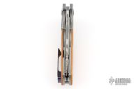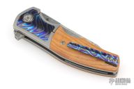 This Mini Crossroads flipper by Reate is a Kirby Lambert design, it features a Damasteel blade with a notched flipper. The handle has a blasted titanium frame, "wood" linen micarta scales, zirconium pivot collars set in the zircuti bolsters, zircuti tip up clip and floating zirconium backspacer. Rides on bearings, nice detent, lockup and blade seating. Comes with original box and Velcro case. Excellent condition.