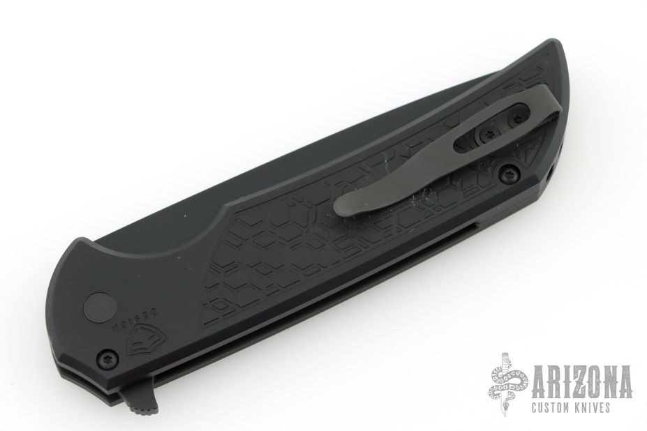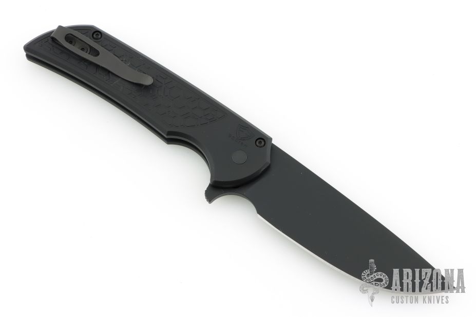 This Mordax by Pro-Tech is a Ferrum Forge design and features a black DLC drop point blade. The handle has a black aluminum frame with black tip up stainless steel clip. Comes with original box, pouch and papers. Excellent condition.
