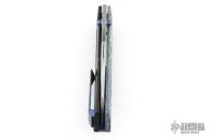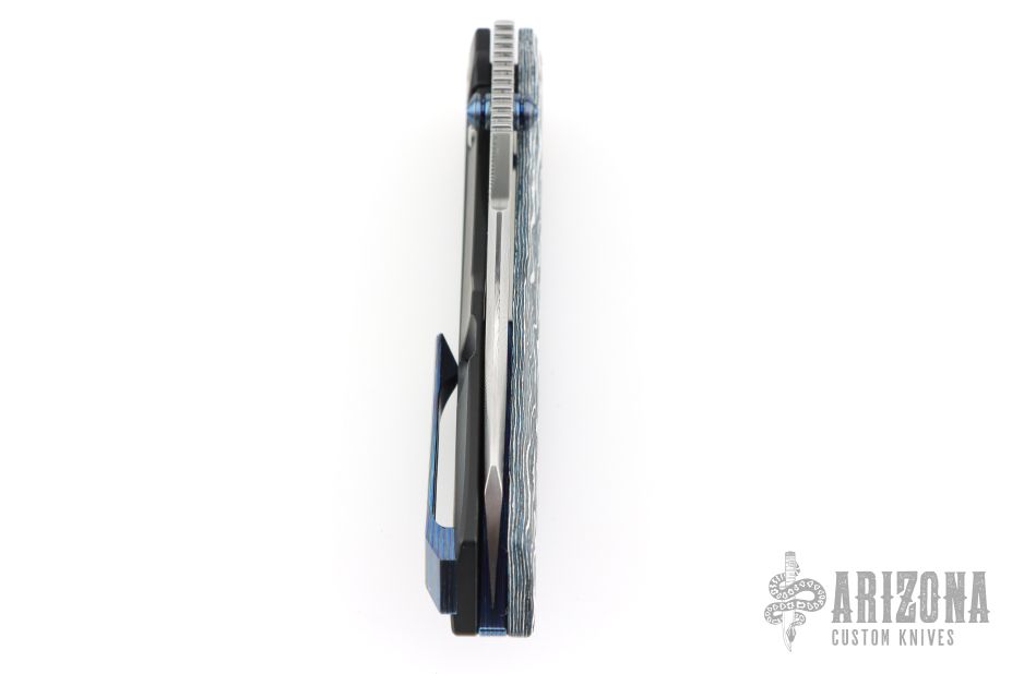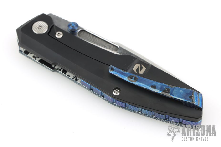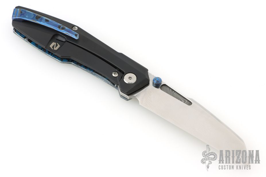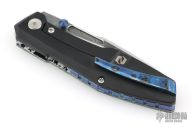 This Raikou by Null Knives features a Bjorkman's Twist Damasteel blade with notched thumbrest and dual titanium thumbstuds. The handle has a blue/white scale with black titanium frame with satin titanium hardware and DarkTi tip up clip. Comes with original box and papers. Excellent condition. #14/25