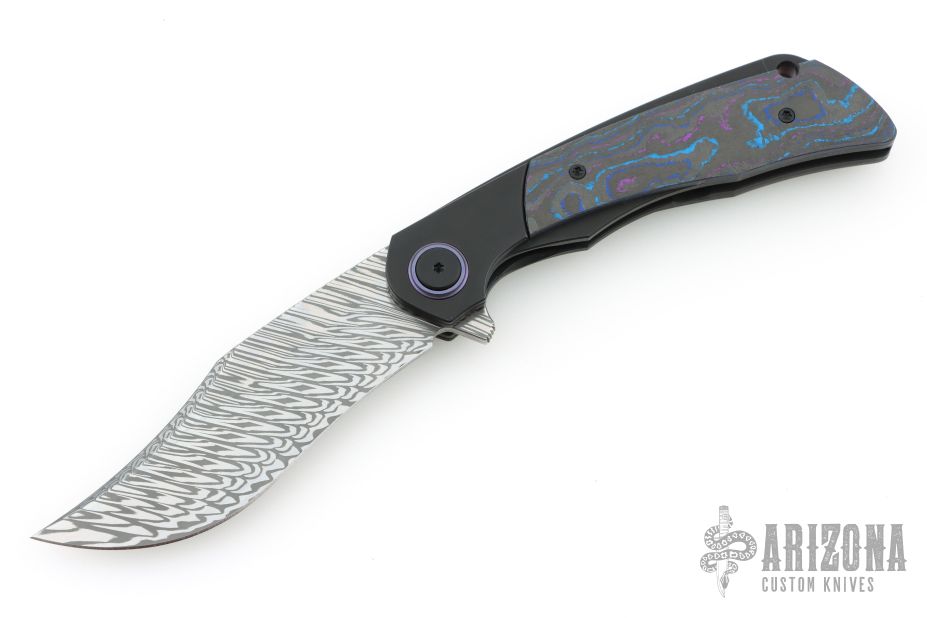 This Sandbar Sabotage by Black Snow and Lee Lerman features a Fafnir Damasteel blade with notched flipper. The handle features black PVD titanium bolsters/liners/pocket clip, black/blue CamoCarbon scales, anodized titanium backspacer. Anodized titanium pivot collars. Comes with original box and zippered case. Excellent condition.