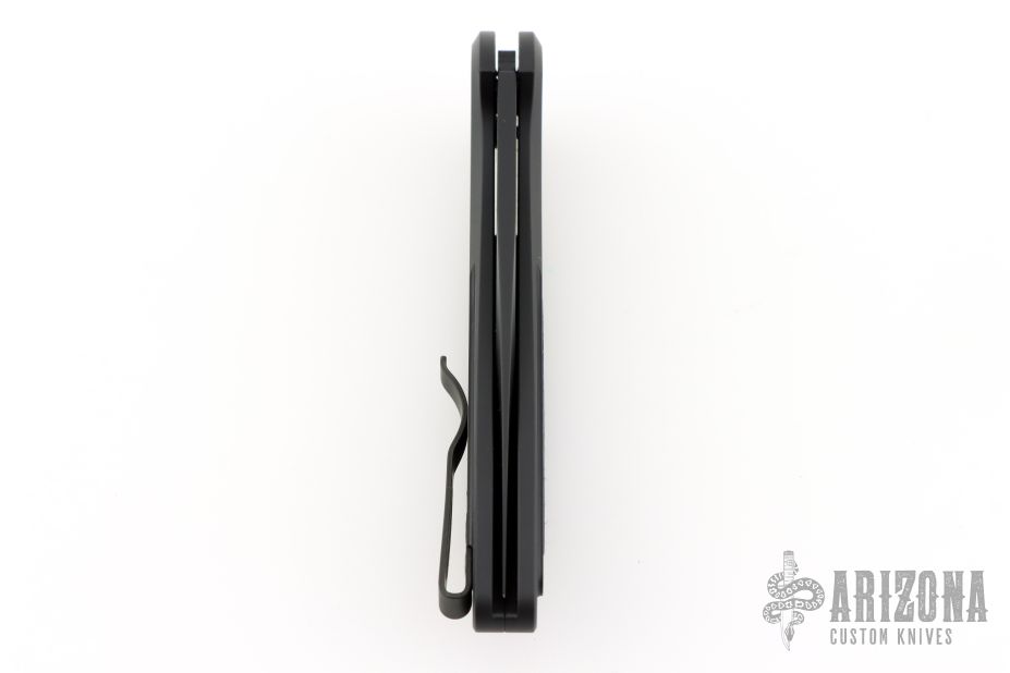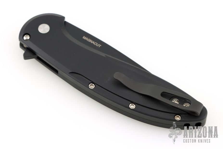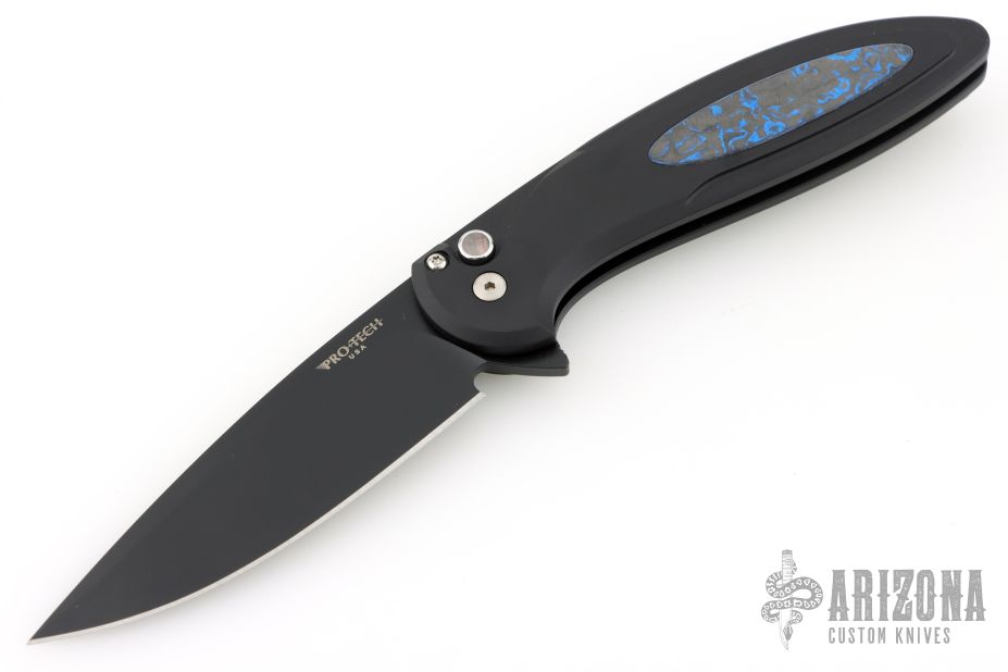 This Cambria flipper by Pro-tech features a black blade with flipper. The handle has a black aluminum frame with carbon fiber inlay in the frame and black lip pearl push button, tip up deep carry stainless steel clip. Rides on bearings, nice detent, lockup and blade seating. Comes with original box, pouch and papers. Excellent condition.