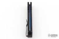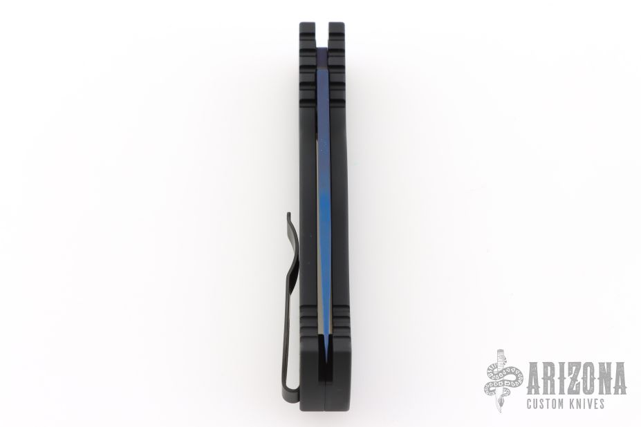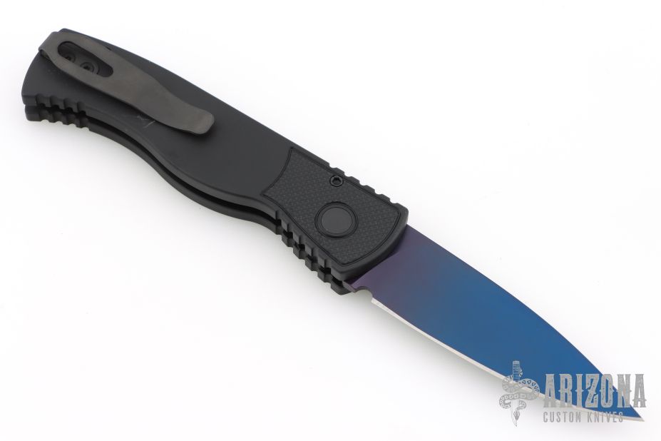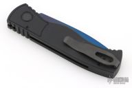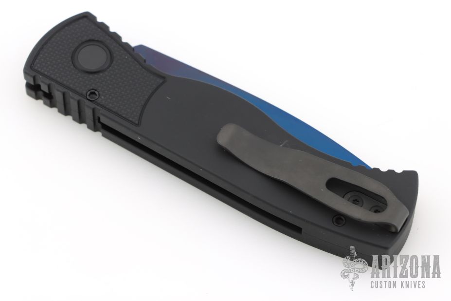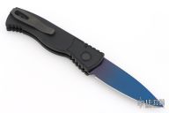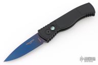 This is a TR-2 side opening auto by Pro-Tech Knives with a sapphire blue blade. It has a black aluminum handle with abalone push button, black deep carry stainless steel clip. Coil spring. Comes with original box, pouch, and papers. Excellent Condition.