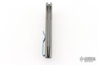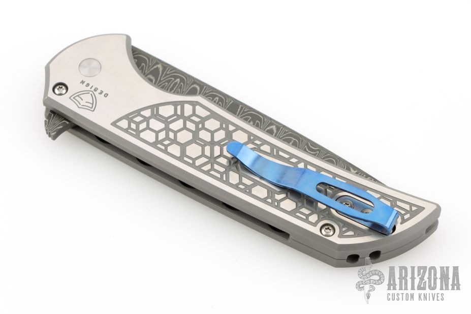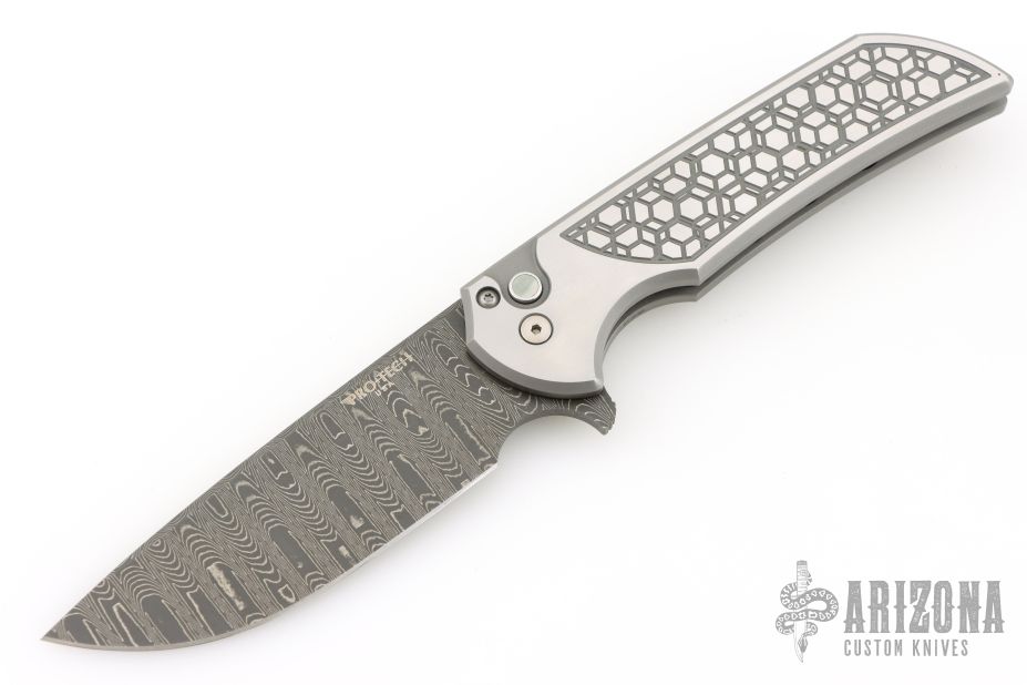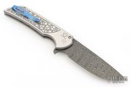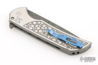 This Mordax by Pro-Tech is a Ferrum Forge design and features a Damascus blade with flipper tab. The handle has a two-tone finished, "gridlock" milled 17-4 stainless frame with blue tip-up titanium clip and pearl inlaid push button. Comes with original box, pouch, and papers. Excellent condition. #1/50