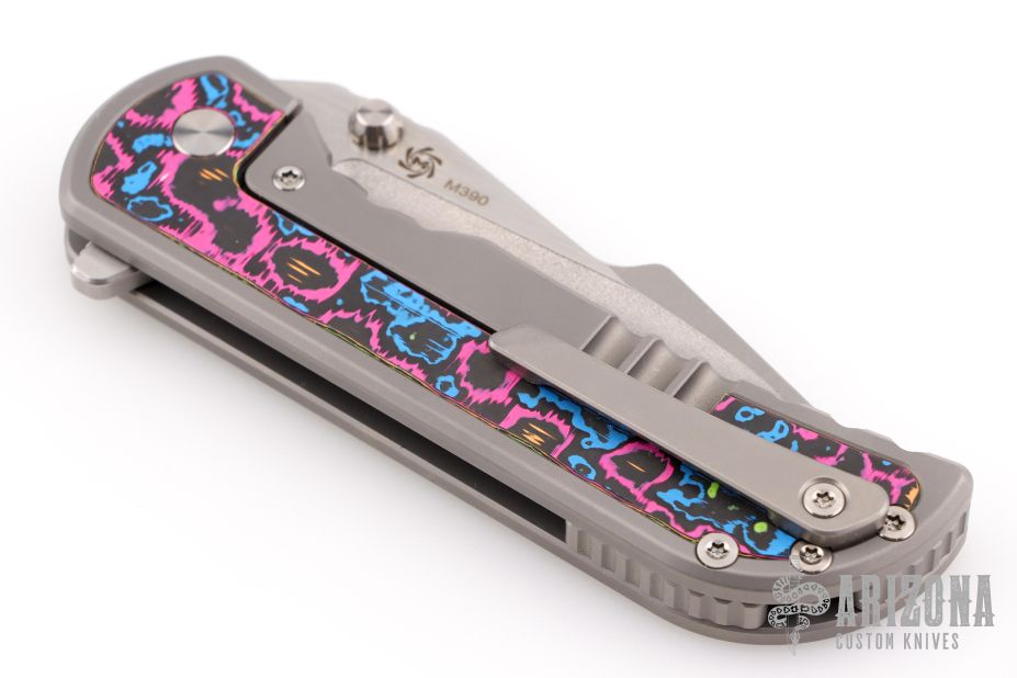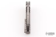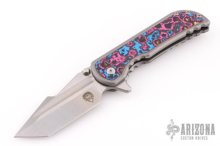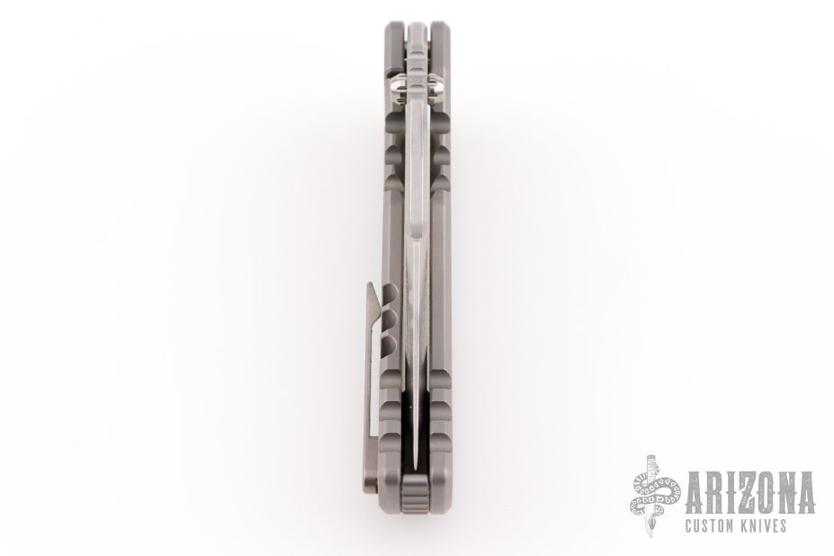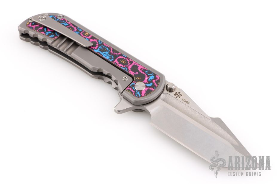 This Apocalypse Flipper by Mechforce is an Alphahunter design. It features a two-tone blade with fullers, dual thumbstuds and a flipper. The handle has a bead blasted titanium frame with fat carbon inlays, titanium backspacer and tip up clip. Rides on bearings, nice detent, lockup and blade seating. Comes with original case. Excellent condition.