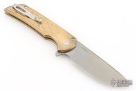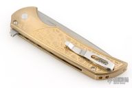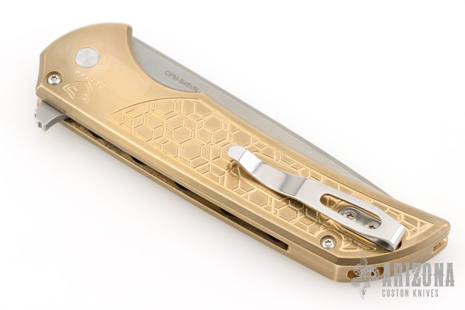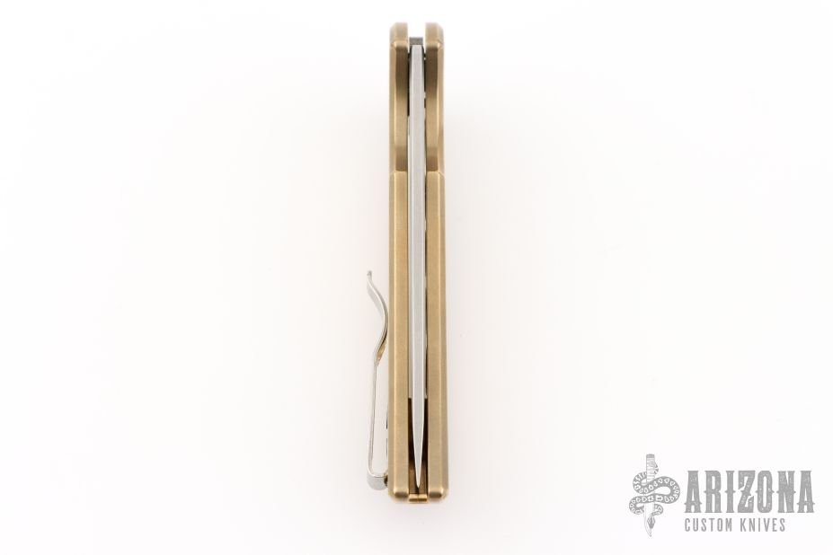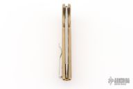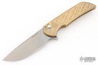 This Mordax by Pro-Tech is a Ferrum Forge design and features a stonewashed drop point blade with flipper. The handle has an aluminum bronze frame with "gridlock" pattern blasted tip up stainless steel clip. Black lip pearl push button. Excellent condition.