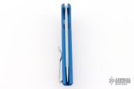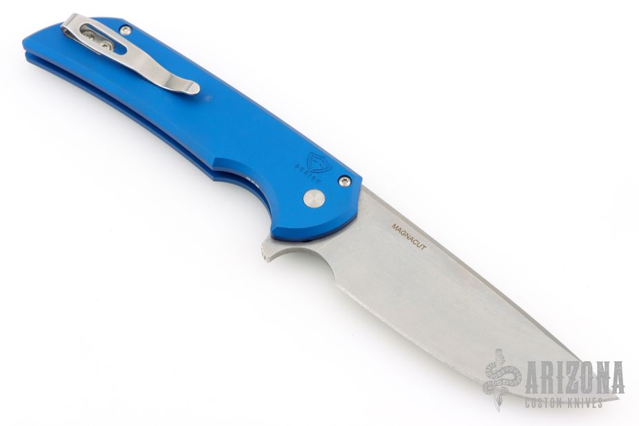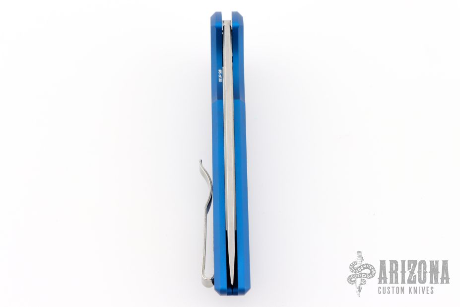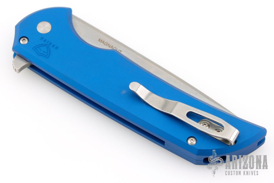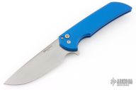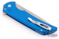 This Mordax by Pro-Tech is a Ferrum Forge design and features a stonewashed drop point blade. The handle has a blue aluminum frame with a bead blasted tip up stainless steel clip. Mosaic pin inlaid button. Comes with original box, pouch, and papers. Excellent condition.