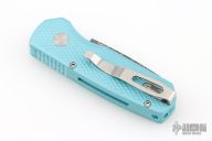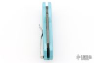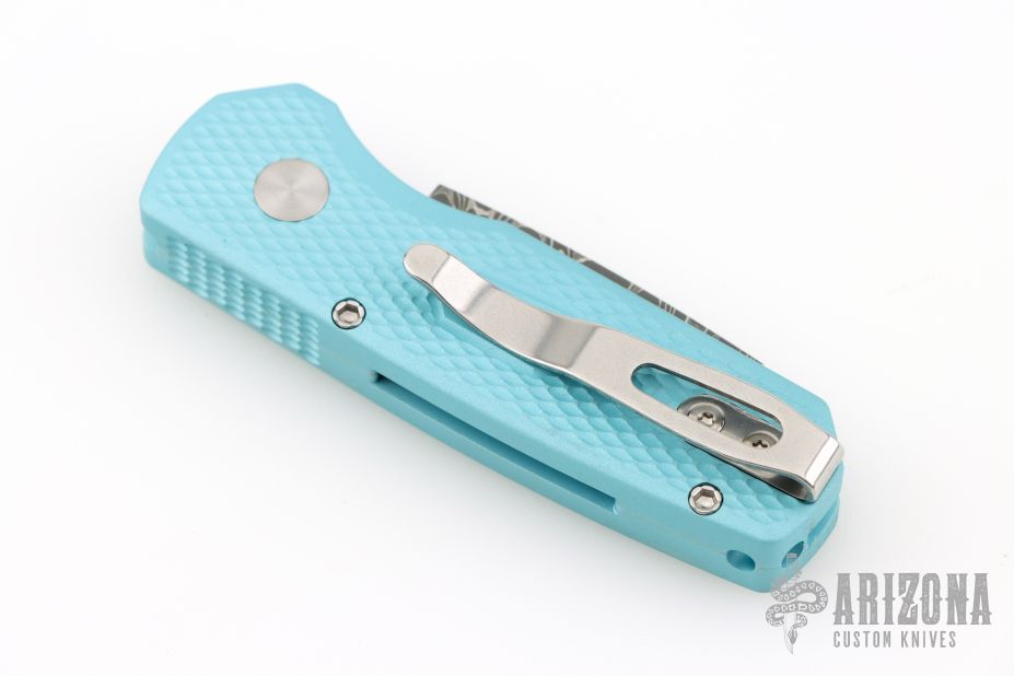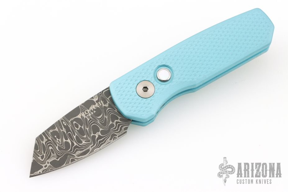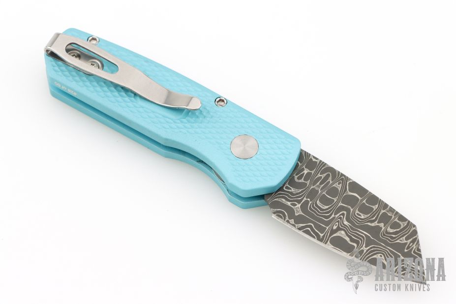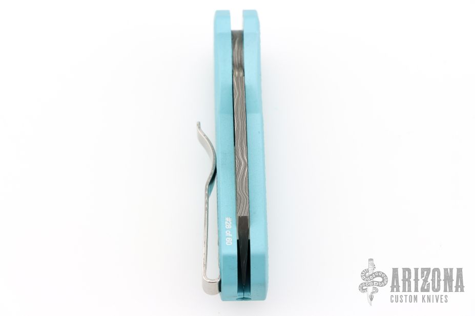 The Runt 5 by Pro-Tech Knives features a Damascus reverse tanto style blade.  The handle features a textured Tiff. Blue aluminum handle with a satin deep carry tip up stainless steel pocket clip. Comes with original box, pouch, and papers. Excellent condition. #28/60