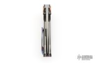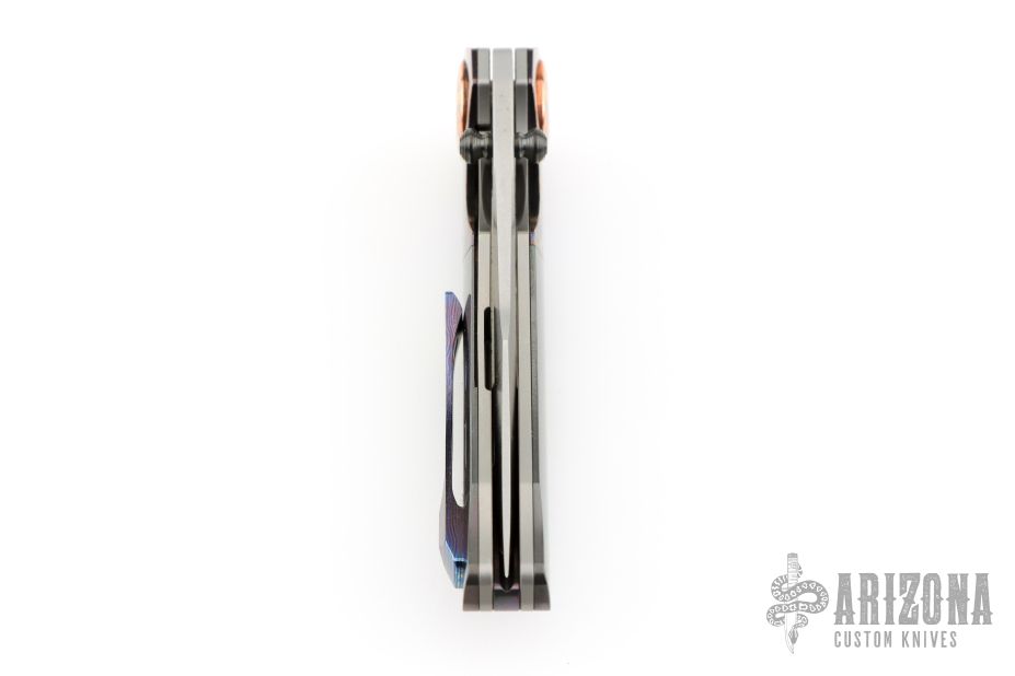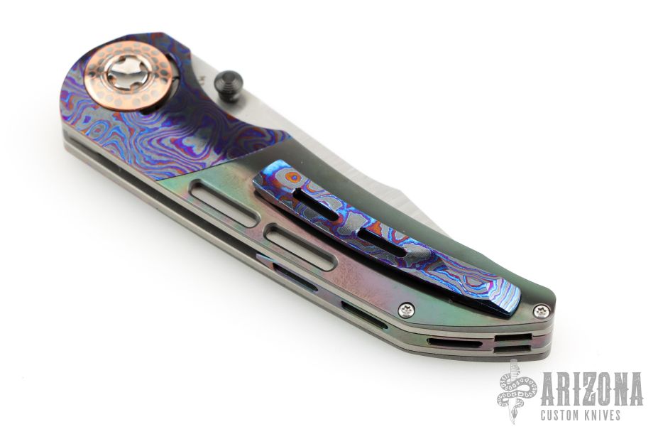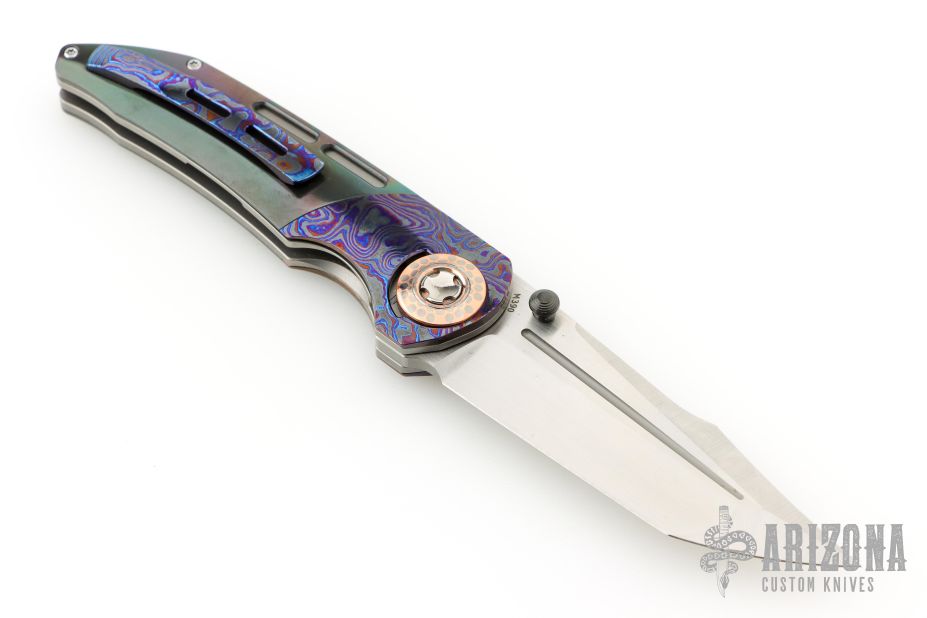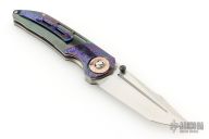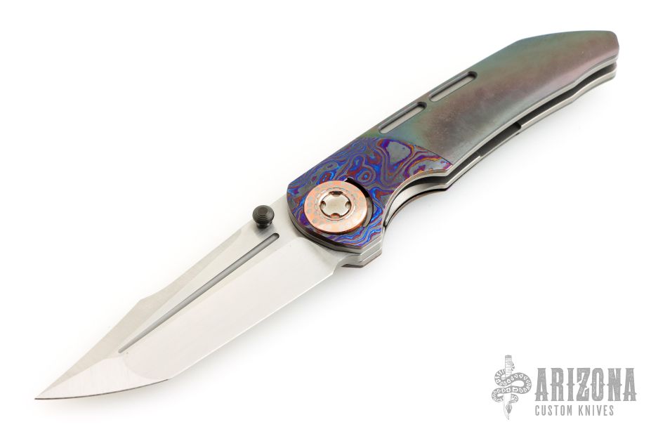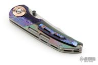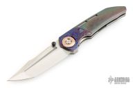 This Wild Hunt by Rain Blade features a hand rub satin finished blade with fullers and dual zirconium thumbstuds. The handle has ZircuTi bolsters, zirconium scales, super conductor pivot collars, blasted titanium liners, tip up ZircuTi clip. Rides on bearings, nice detent, lockup and blade seating. Comes with original zippered case, COA and extra pivot collars. Excellent condition.