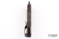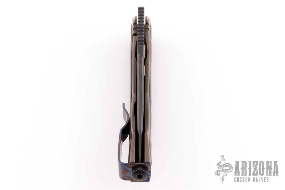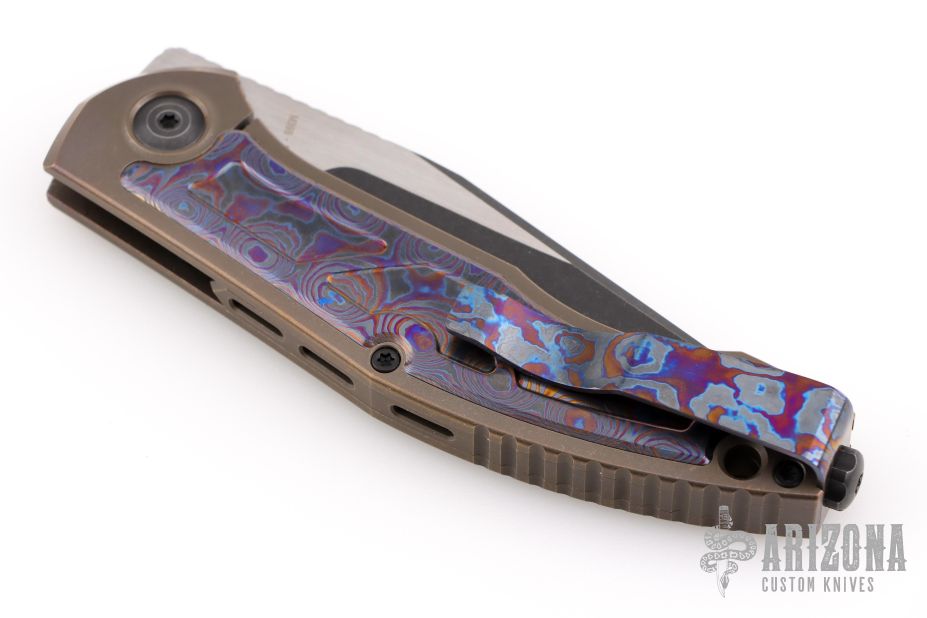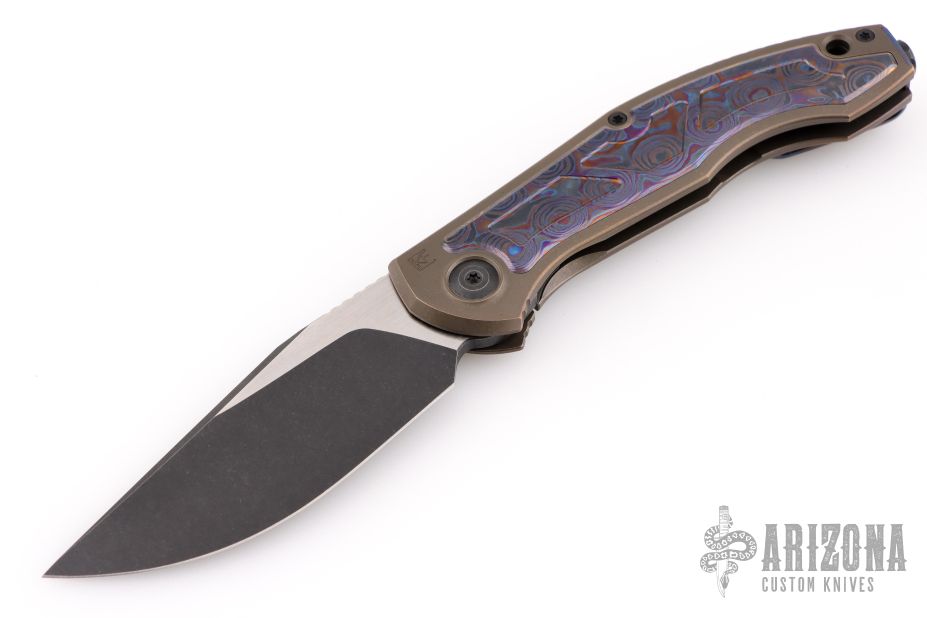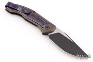 This Veksha model by Custom Knife factory is an Anton Malyshev design that is based on the classic Soviet folding knife the Belka. It features a tumbled and anodized titanium frame with milled ZircuTi inlays. Two-tone clip point blade with notched thumbrest and front flipper. ZircuTi reversible tip up pocket clip, lanyard hole in the titanium backspacer. Comes with maker's nylon zippered case, cloth, and COA #21 dated 5-24. Excellent condition.