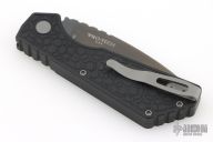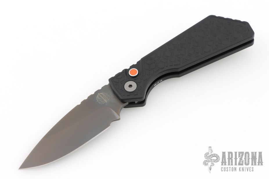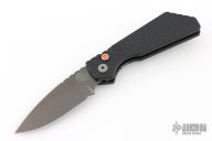 This Pro-Strider PT by Pro-Tech and Strider Knives features a Smokey Grey DLC blade with notched thumbrest. The handle has a milled black aluminum frame with grey hardware and grey stainless steel tip up clip.  Orange G10 inlaid push button. Comes with original box, pouch, and papers. Excellent Condition.