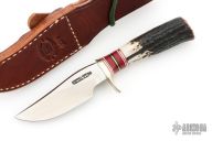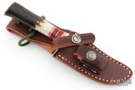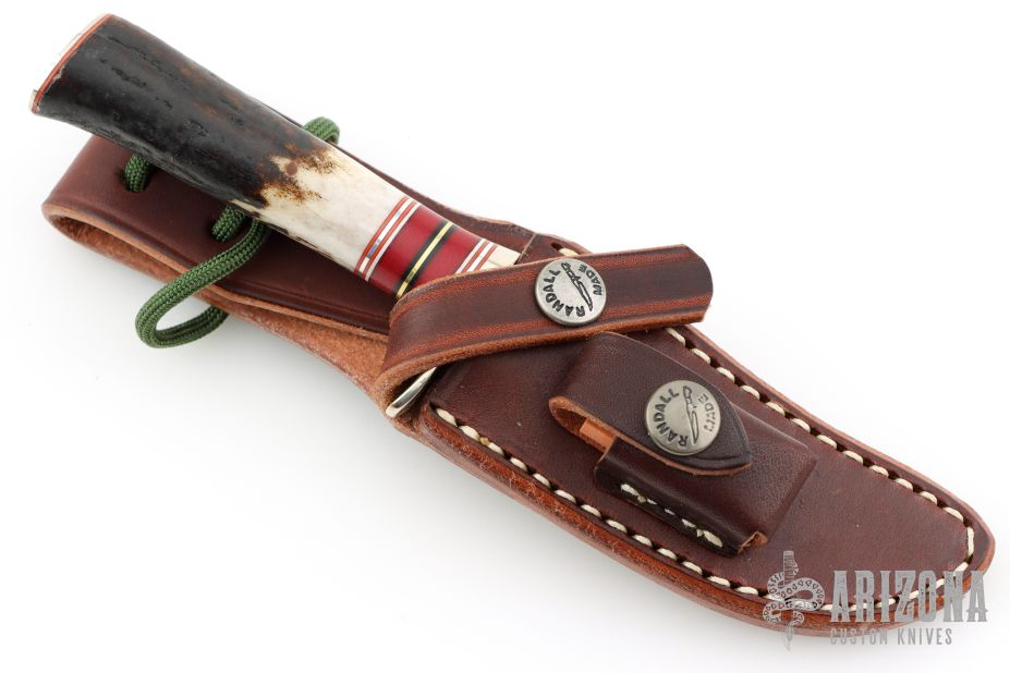 The miniature Model 27 debuted in Randall's 2012 75th anniversary catalog and is the first catalog miniature model. This knife has a satin finished stainless steel blade, .188" blade stock and 1.091" blade depth, hidden tang construction. The handle has a nickel silver guard and butt plate, and a stag handle with red, duralumin, white, red linen micarta, black and brass spacers. Comes with a brown leather sheath with miniature stone. Excellent condition.