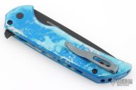 This Mordax by Pro-Tech is a Ferrum Forge design and features a black drop point blade. The handle has a blue/white aluminum frame with bead blast and blue anodized tip up titanium clip. Mother of pearl push button. Comes with original box, pouch, and papers. Excellent condition.