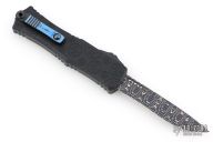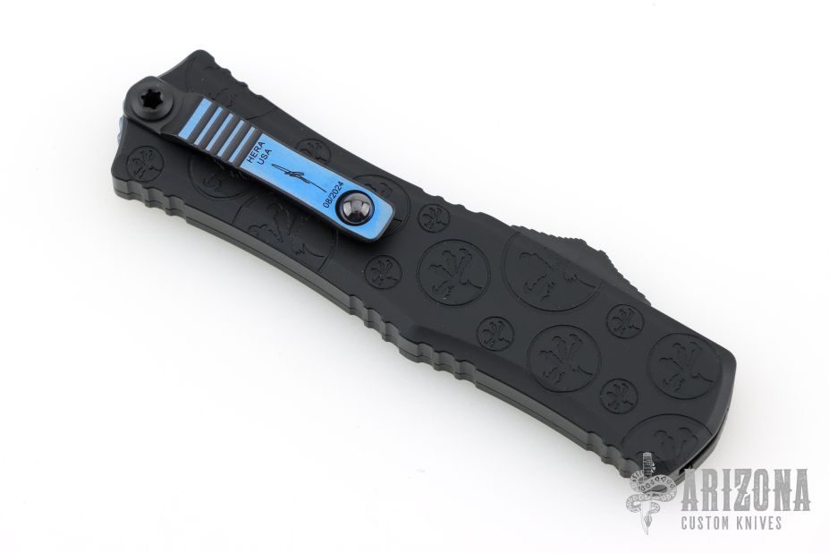 This Hera from Microtech is a Signature Series knife and features a Vegas Forge Spirograph Damascus recurve blade. The handle has a claw burst black aluminum chassis with a blue anodized titanium pocket clip. Includes the original box, papers, and metal COA.  08/2025.  Excellent Condition.