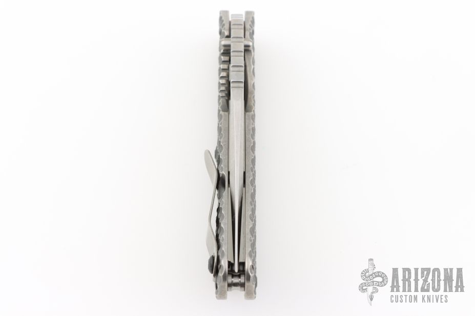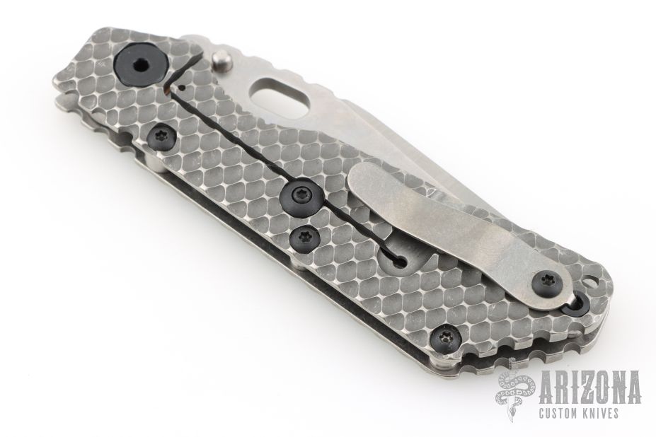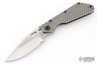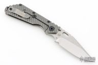 This SMF DGG by Strider has a Bowie blade with dual thumbstuds, thumbhole, and a notched thumbrest. The handle has a titanium "Gunner Grip" frame lockbar stabilizer, and titanium tip up clip. Nice detent, lockup and blade seating. New condition.