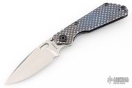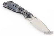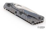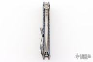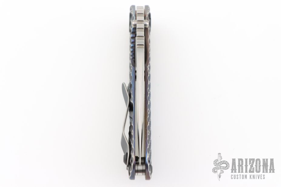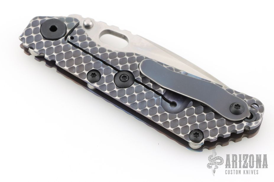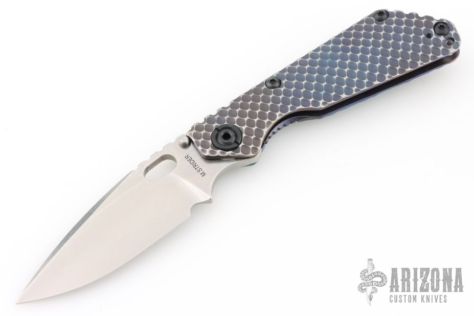 This SNG DGG by M Strider has a stonewashed blade with dual thumb studs, thumbhole, and notched thumbrest. The handle has a heat colored bead blasted titanium "Gunner Grip" frame, lockbar stabilizer, and titanium tip up clip. Nice detent, lockup and blade seating. New condition.