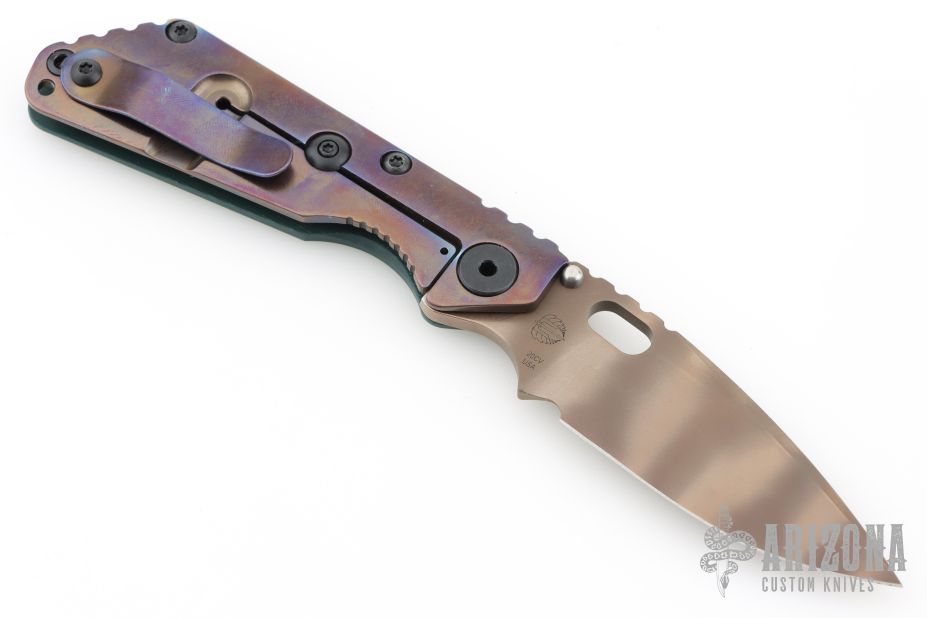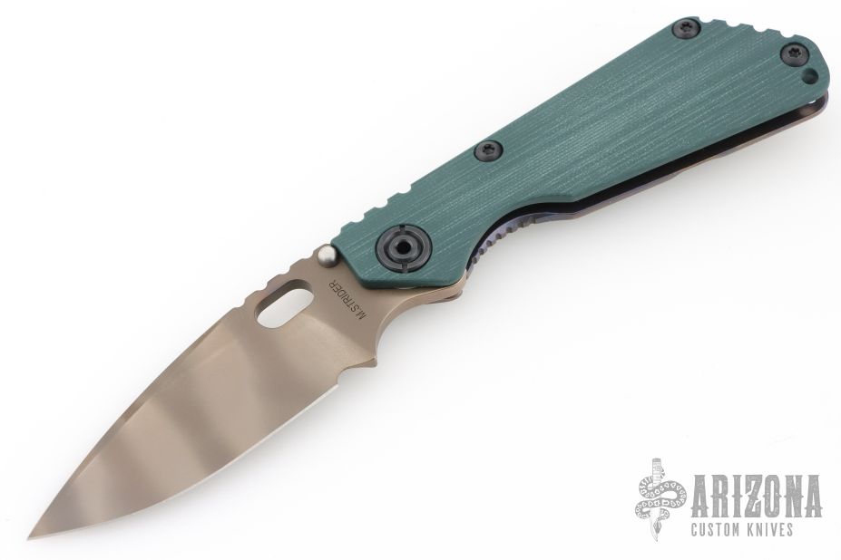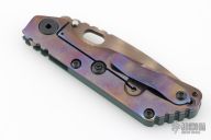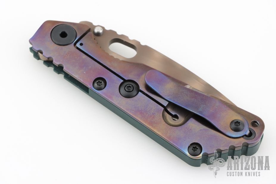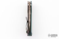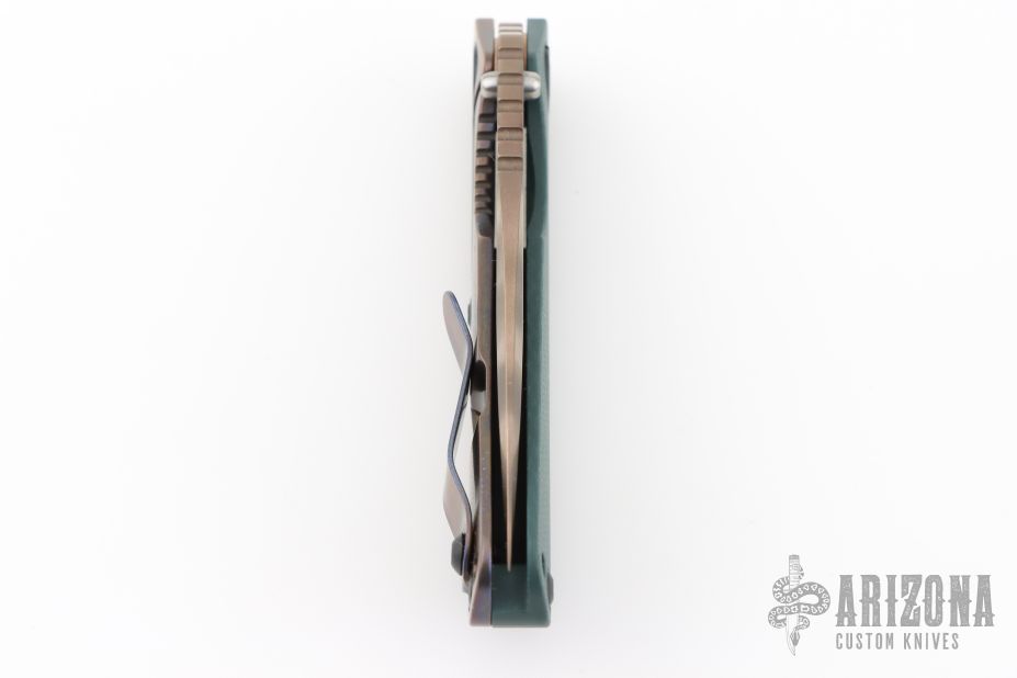 This SnG CC by Strider Knives features a ghost stripe blade and smooth forest green G-10 with a heat colored titanium frame and tip up clip. Notches on thumbrest, rear of handle, and lockup. Includes Hinderer "Lock Bar Stabilizer" for maximum reverse lock retention. Has black hardware. New condition.