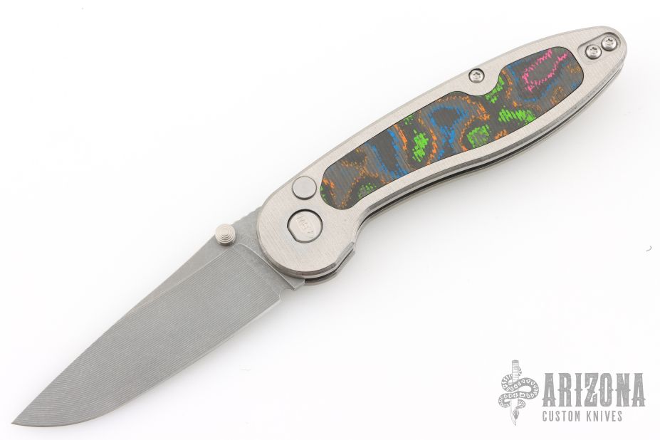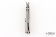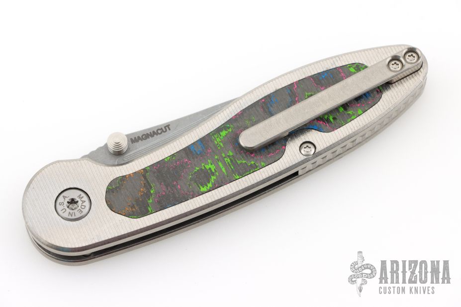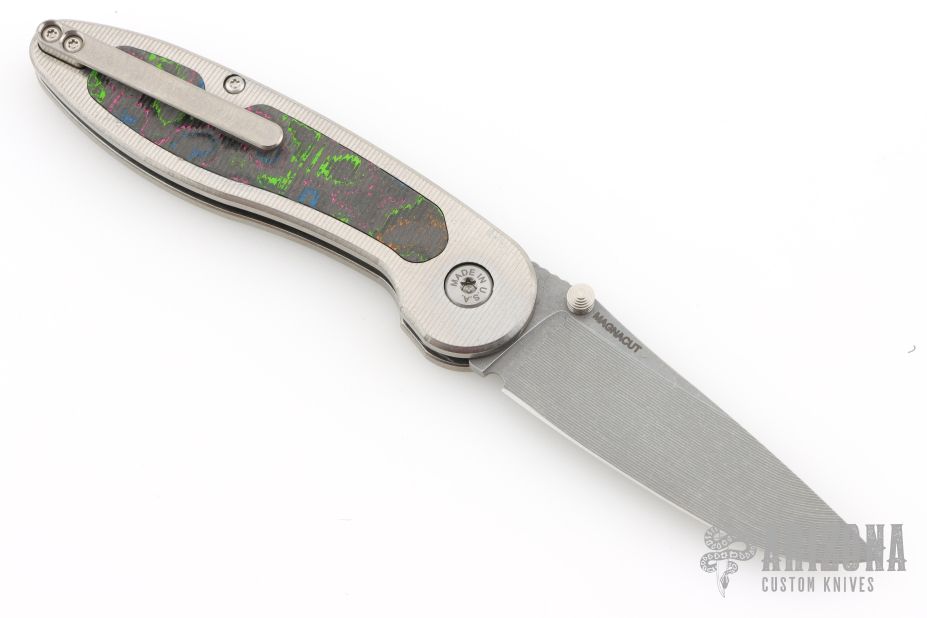This rendition of Model 1 is a mid-tech, flipper knife, with a frame lock. The handles are made from milled titanium. The blade is made of Magnacut stainless and has been heat-treated and cryogenic tempered. The blade rides on ceramic caged bearings and hardened stainless thrust washers. The pivot and pivot screw has been made from hardened 416 stainless. The liners and pocket clip are made from titanium while sporting a ceramic detent ball. The knife and materials used are all 100% American Made. Comes with original zippered case. Excellent condition. Blade Runner HQ Exclusive in 80's camo carbon.