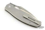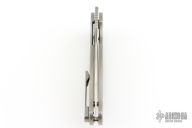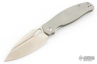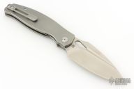 This Sabertooth by Monterey Bay Knives features a satin finished blade with fullers, notched thumbrest and thumbhole. The handle has a bead blasted titanium frame with matching tip up clip. Rides on bearings, nice detent, lockup and blade seating. Comes with original zippered case and extra hardware. Excellent condition.
