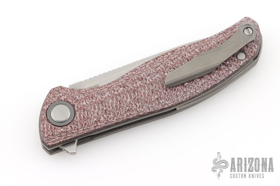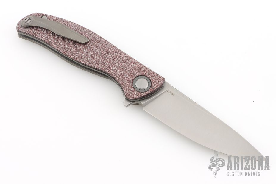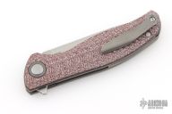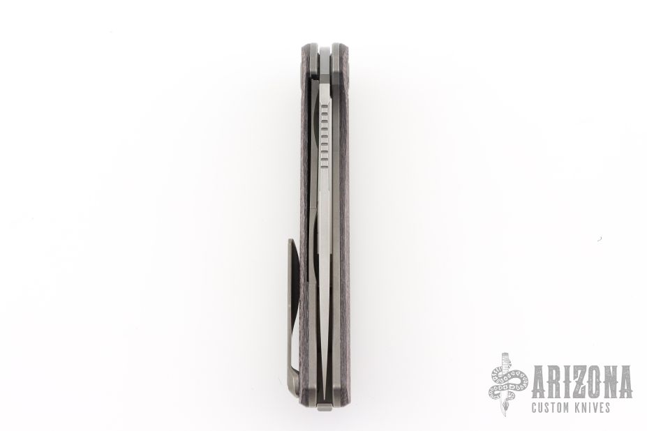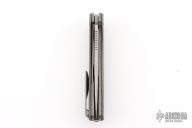 This F3 Flipper from Shirogorov has a tumbled flat ground spear point blade with notched flipper. Handle has brown Alutex scales, tumbled titanium backspacer, tip up clip and liners. Recessed lanyard bail. Dead center blade seating, excellent detent and lockup. Rides on Multi-Row bearings. Comes with original box, cloth, and papers. Excellent condition.