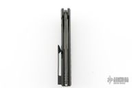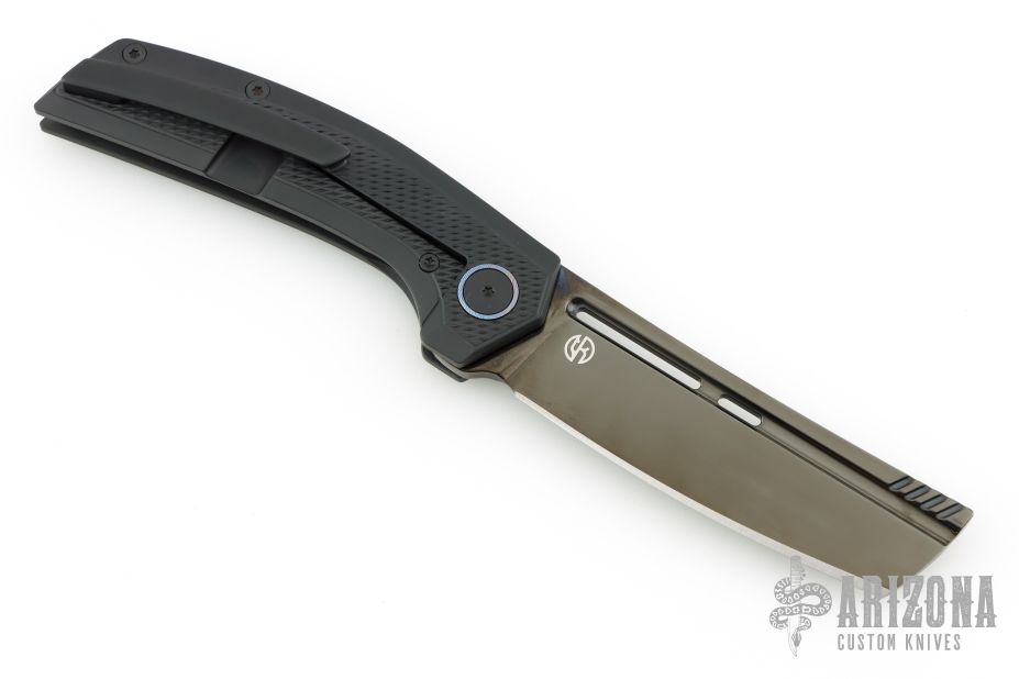 This knife features a black semi-mirror polished blade. The handle has a black titanium frame with a matching tip up pocket clip and backspacer. Timascus pivot collars and inlay. Includes a wooden display case, box and coa. New from maker!