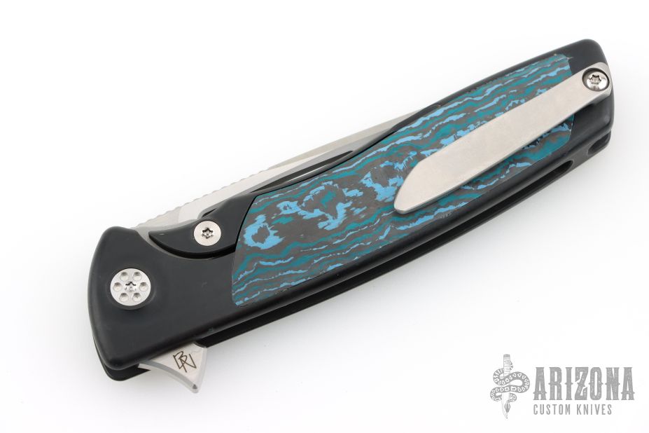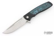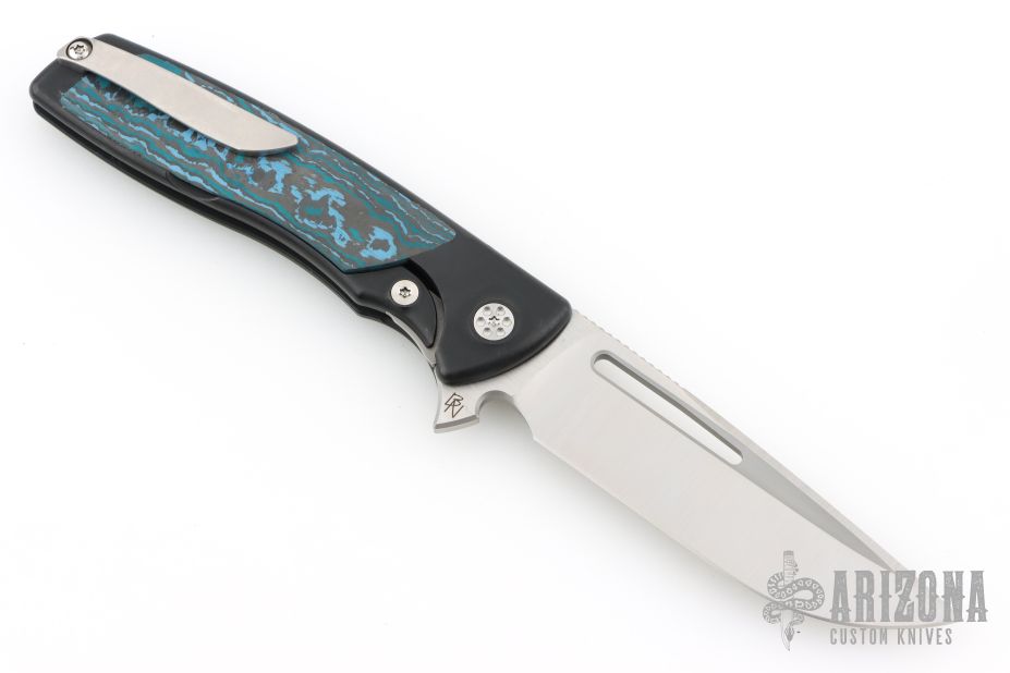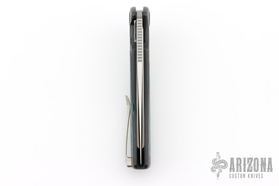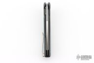 This Evo Typhoon from Brian Nadeau features a satin finished blade with a fuller and thumbrest. The handle is comprised of a PVD titanium frame with fat carbon inlays, satin titanium tip up clip. Rides on bearings, nice detent, lockup and blade seating, stainless lockface insert. Comes with original box. Has a couple light scuffs, excellent condition otherwise.