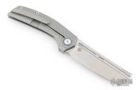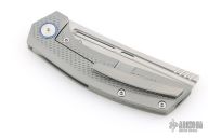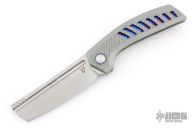 This knife features a stonewashed cleaver style blade. The handle has a titanium frame with a matching tip up pocket clip and backspacer. Timascus pivot collars and inlay. Includes a wooden display case, box and coa. New from maker!