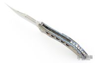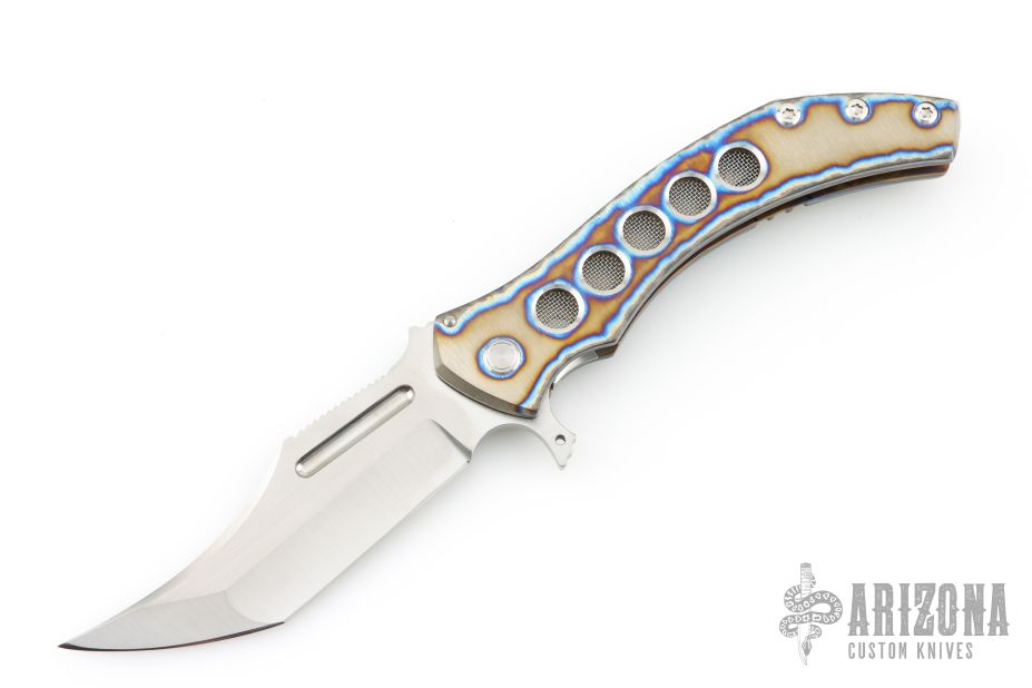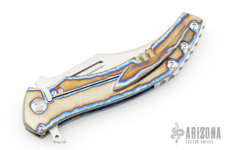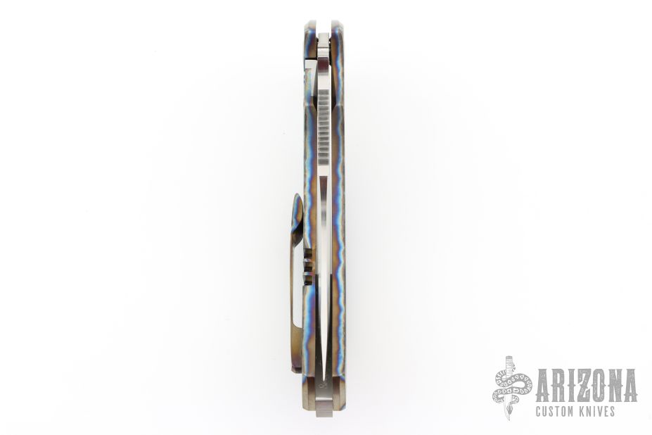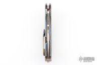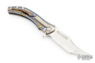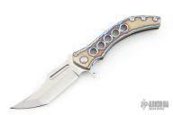 This Framelock Flipper by Sergey Rogovets features a satin finished blade with false top edge and notched thumbrest. The handle has an anodized titanium frame with hole pattern and wire mesh underlays, notched titanium backspacer, anodized tip up titanium clip with hidden screws. Nice action, lockup and blade seating. Comes with original box and COA #2461 dated 10.20.24. Excellent condition.