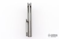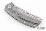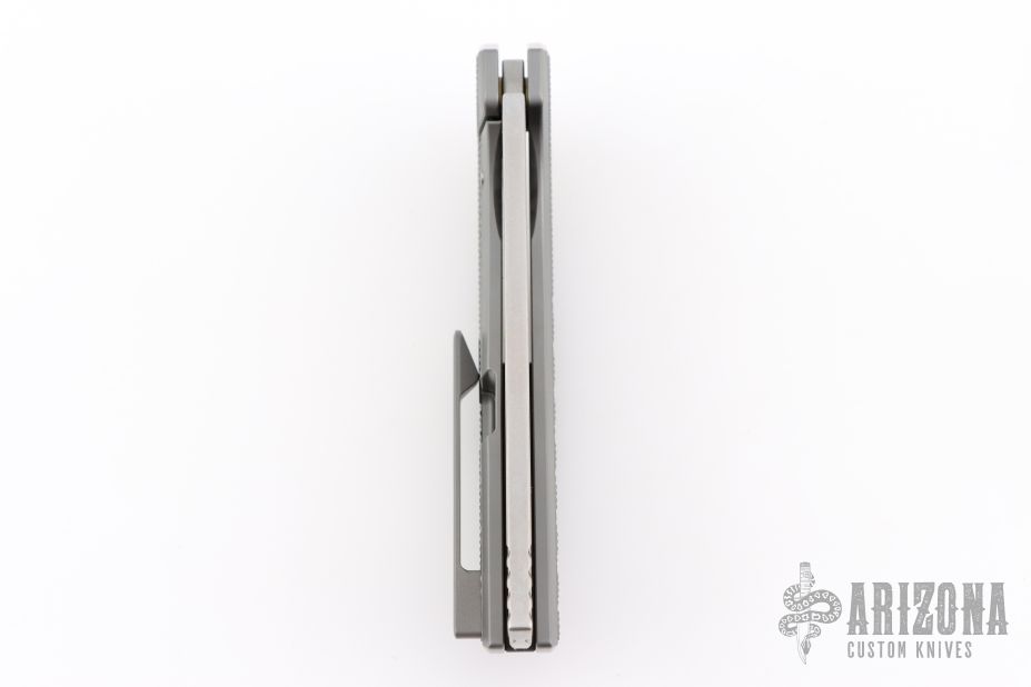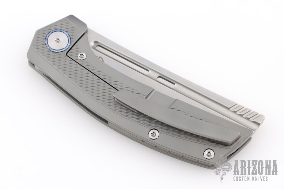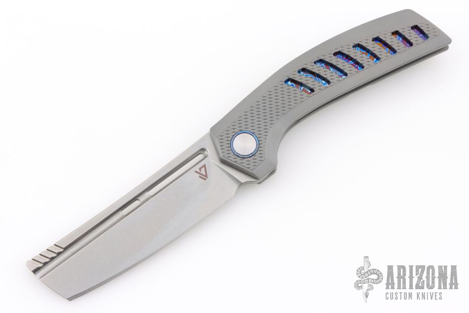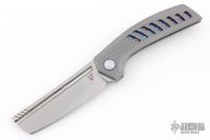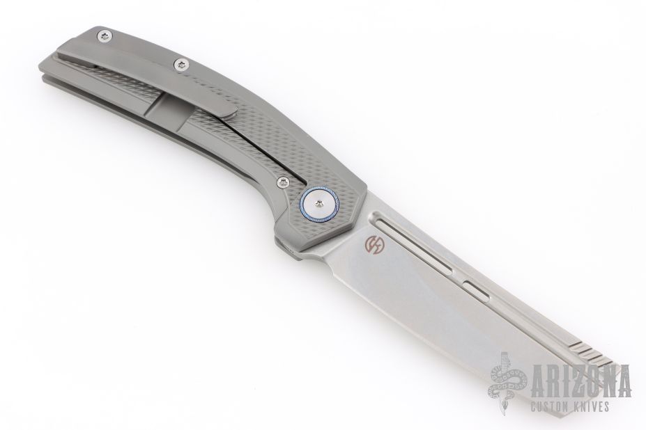 This knife features a stonewashed cleaver style blade.  The handle has a titanium frame with a matching tip up pocket clip and backspacer.  Timascus pivot collars and inlay.  Includes a wooden display case, box and coa.  The display case and box were damaged in transit.  New from maker!