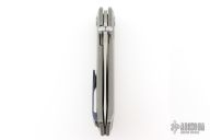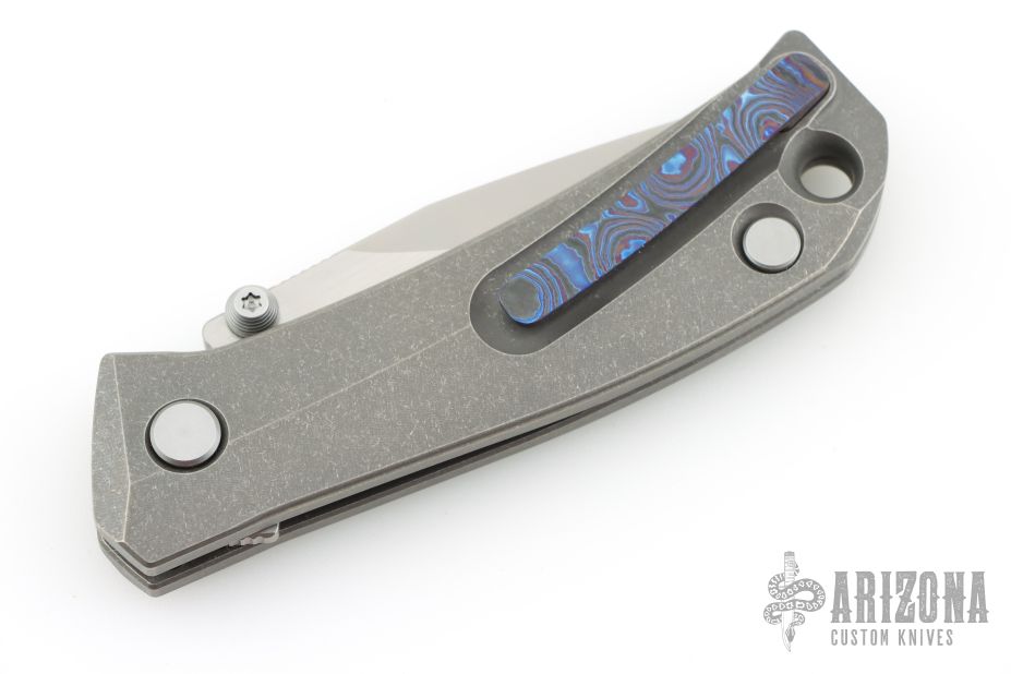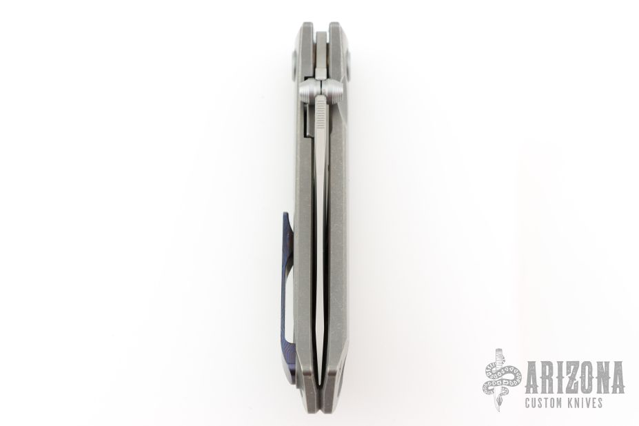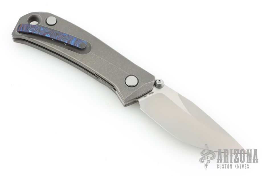 This Brat Knife features a bead blast finished drop point blade with a notched thumb rest and dual thumbstuds. The handle has a tumbled titanium frame and tip up Zircuti pocket clip.  Includes a COA, extra hardware, and a padded velcro case.  S/N 344. Dated 05/24. Has some light spots on the blade, great overall condition.