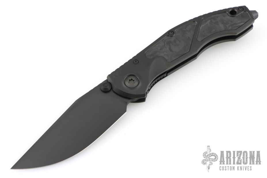 This linerlock was designed by Marfione Custom Knives and manufactured by CKF. This knife features a black finished clip point blade with a filed thumbrest. The handle is composed of black titanium with marble carbon fiber inlays. Black titanium tip up pocket clip. Includes a padded Velcro case, COA dated 10-24, and extra hardware. Excellent condition. #218