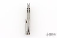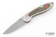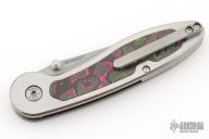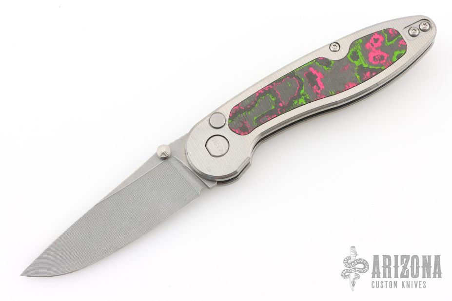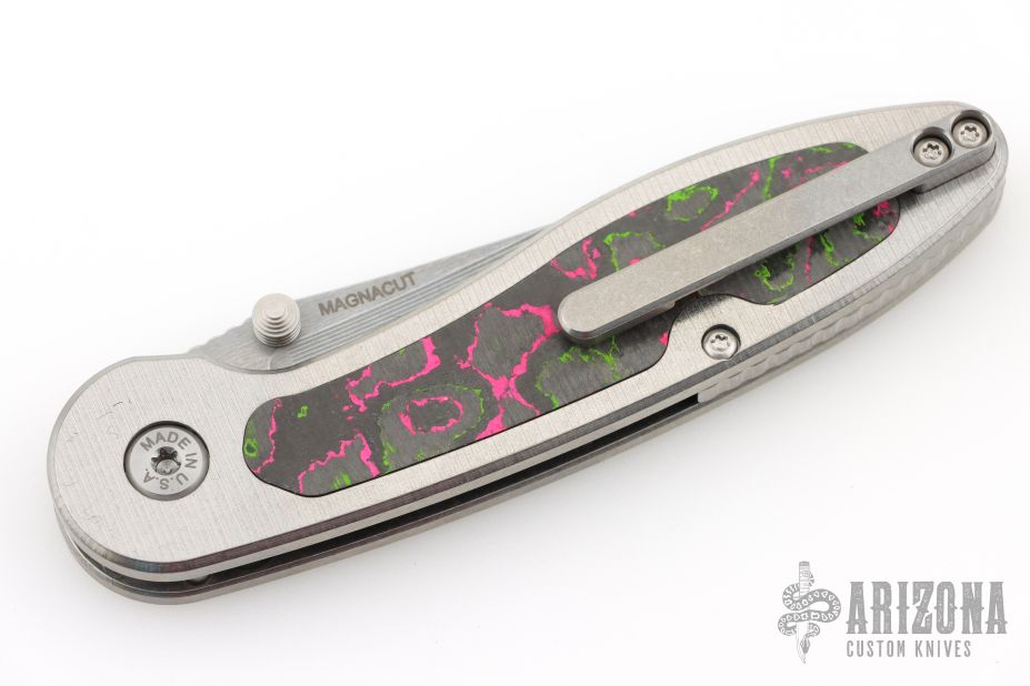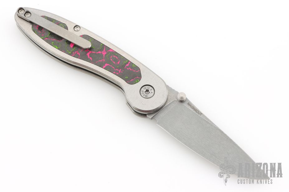 Model 1 Button Lock. The Handle is Milled Titanium with a fat carbon inlay. The blade is made of Magnacut stainless with 3D milling and has been heat-treated and cryogenic tempered. The blade has a light stonewash finish. The blade rides on ceramic caged bearings and hardened stainless thrust washers.  Ceramic detent ball. The pivot and pivot screw has been made from hardened 416 stainless. With a Titanium backspacer, pocket clip, and thumb stud.
