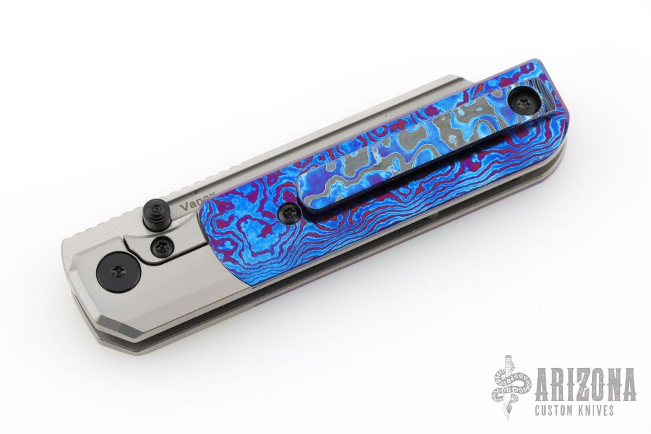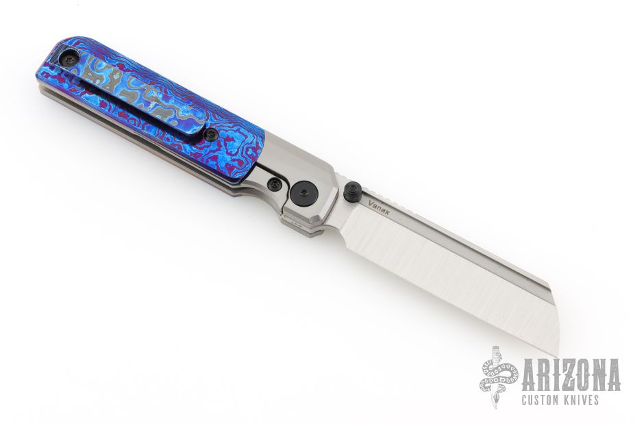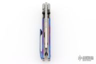 The RR Station Express Supreme features bead blasted chamfered titanium handles, paired with a hand ground, belt satin, Vanax blade. The 'Standard' finish is simple, straightforward and clean. Black hardware, standoffs, timascus covers, and zircuti tip up clip. Includes the original box and papers.  S/N 37.  Excellent Condition.