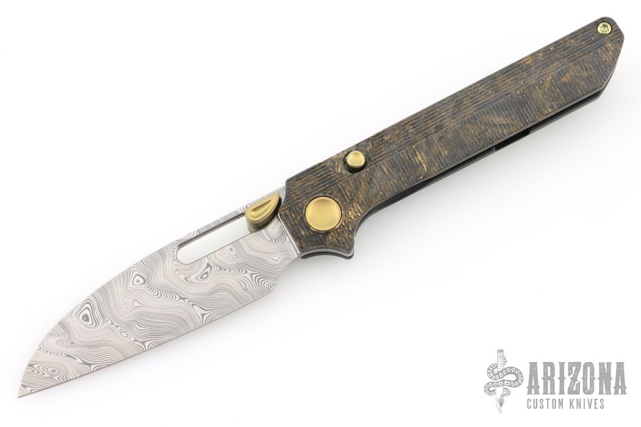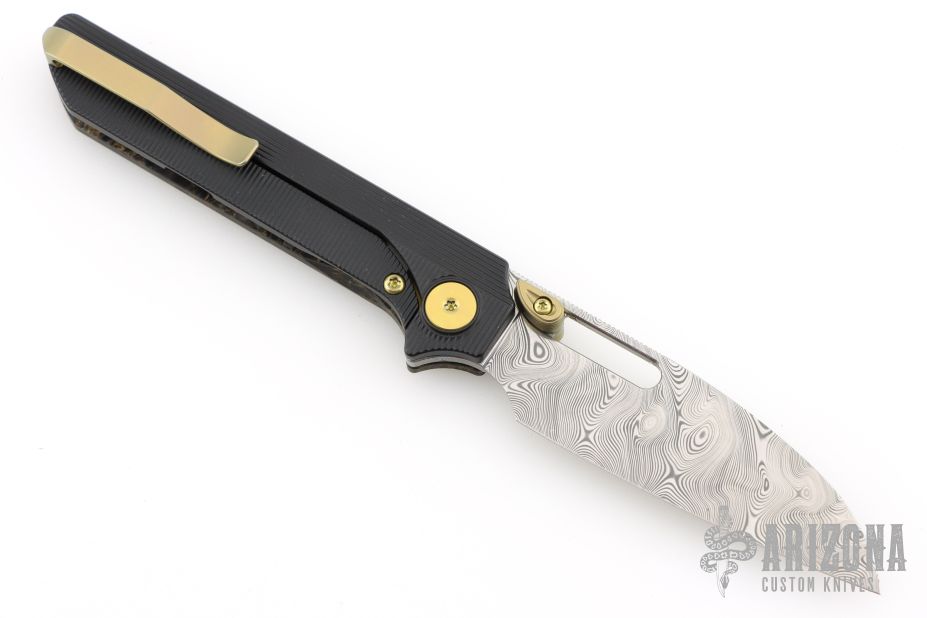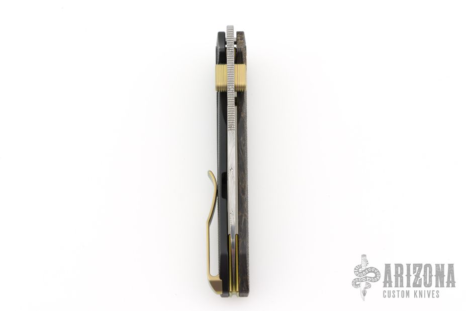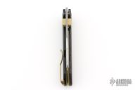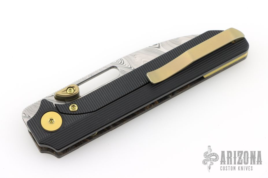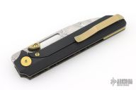 This SLIM by Golden Designworks features a hand rub satin finished blade with thumbhole, dual thumbstuds and notched thumbrest. Works well as a front flipper. The handle has milled black finished titanium scales, gold carbon fiber cover scale, gold anodized titanium backspacer and tip up clip. Comes with original box, zippered case and papers. Listing also includes another set of hardware. Excellent condition.