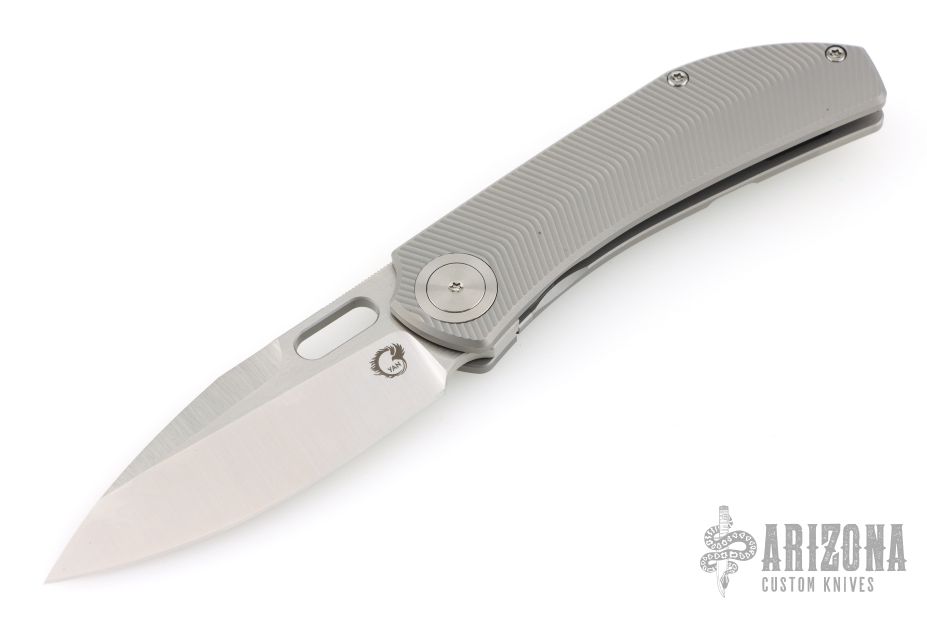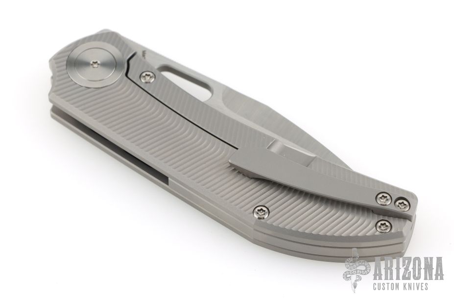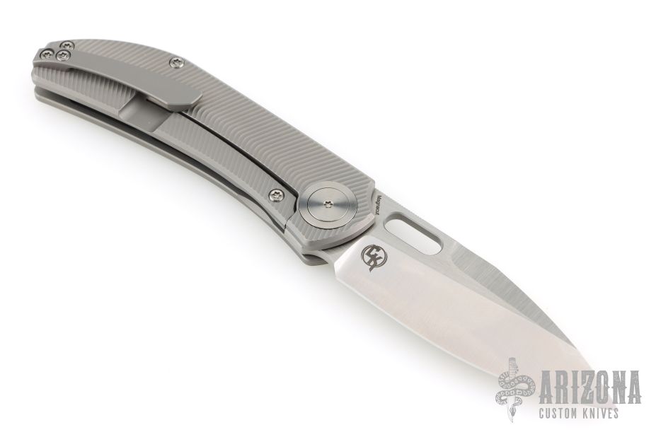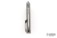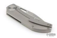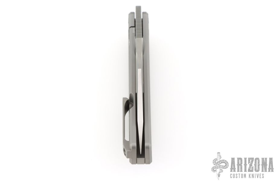 This Chevron is a Christensen design, produced by Yan. It features a satin blade with thumbhole and notched thumbrest. The handle has a milled titanium frame with a bead blast finish, matching backspacer, and tip up clip. Has lock face insert. Comes with original box. Excellent condition.